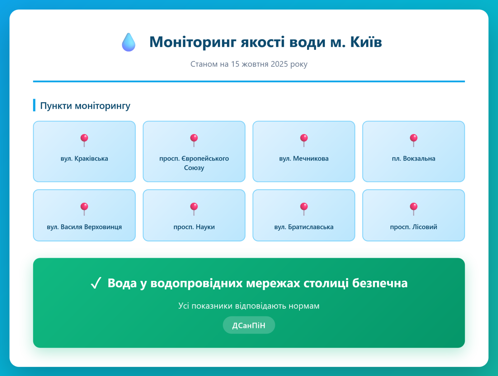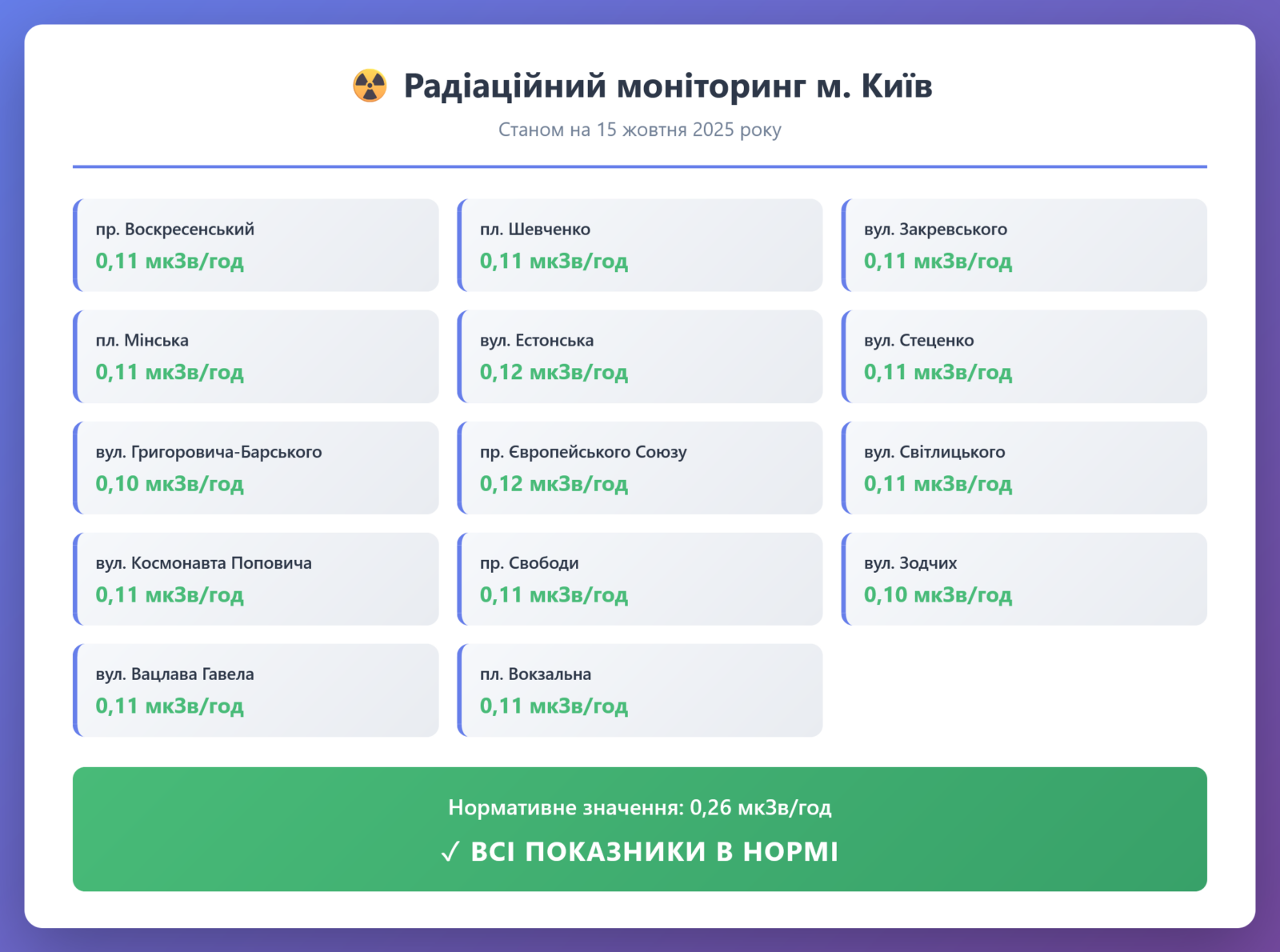 Радіаційний гамма фон, дані по атмосферному повітрю, відібрані проби питної води.