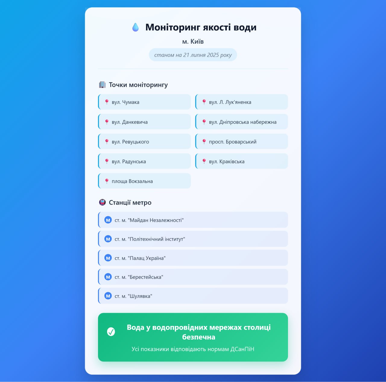 Радіаційний гамма фон, дані по атмосферному повітрю, відібрані проби питної води