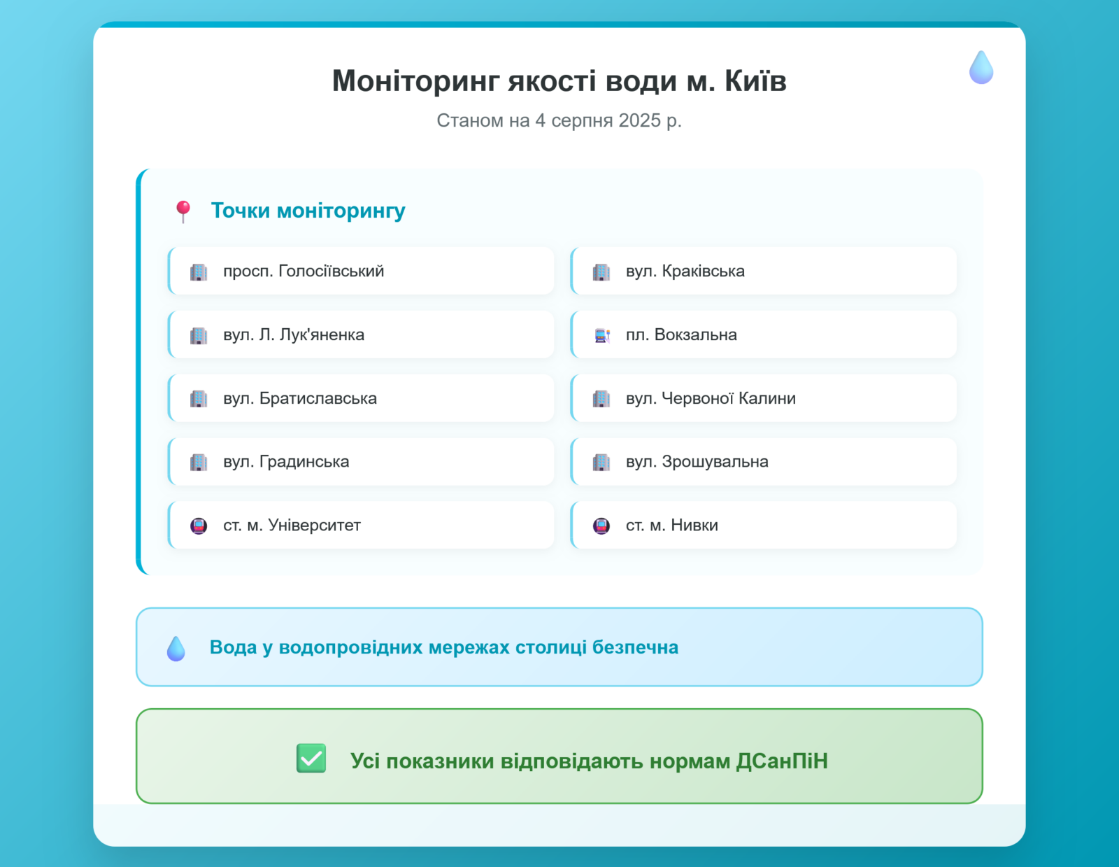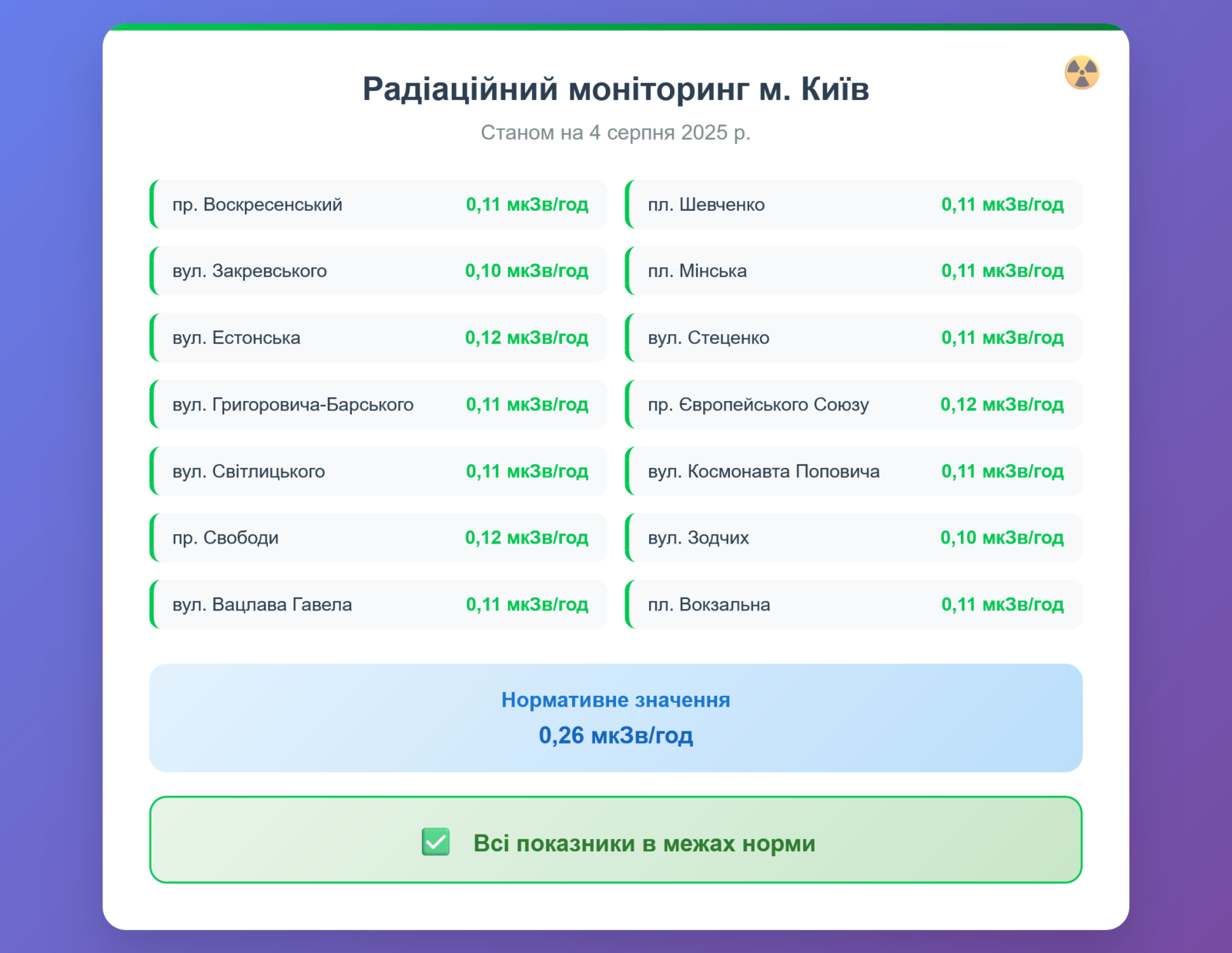 Радіаційний гамма фон, дані по атмосферному повітрю, відібрані проби питної води