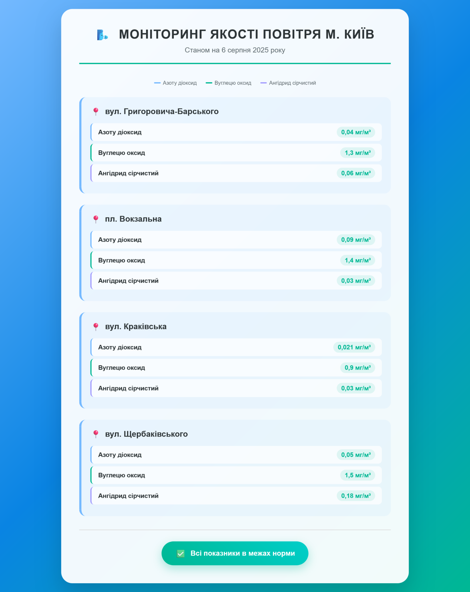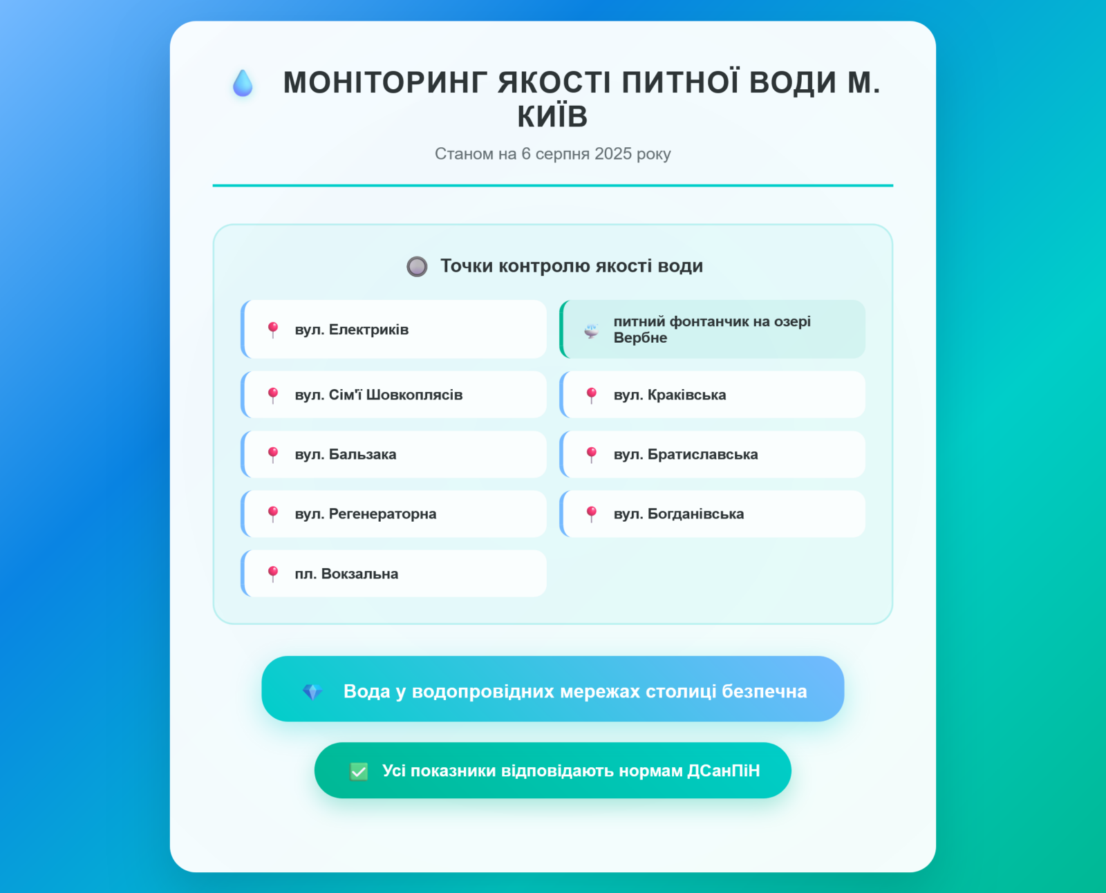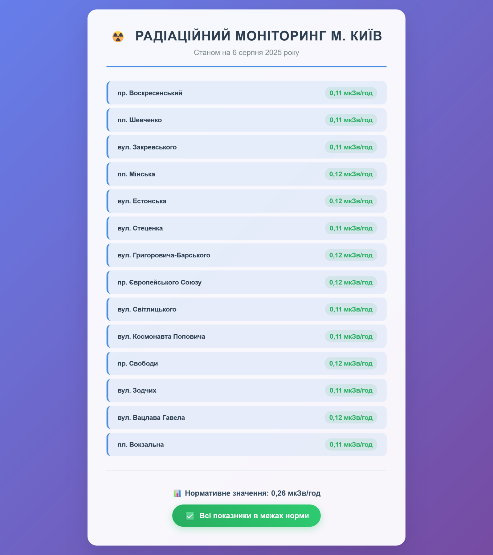 Радіаційний гамма фон, дані по атмосферному повітрю, відібрані проби питної води
