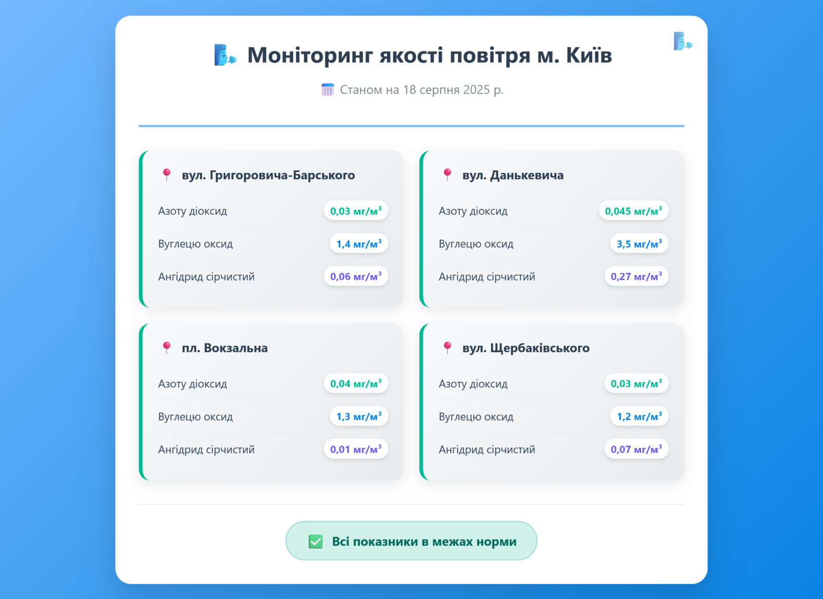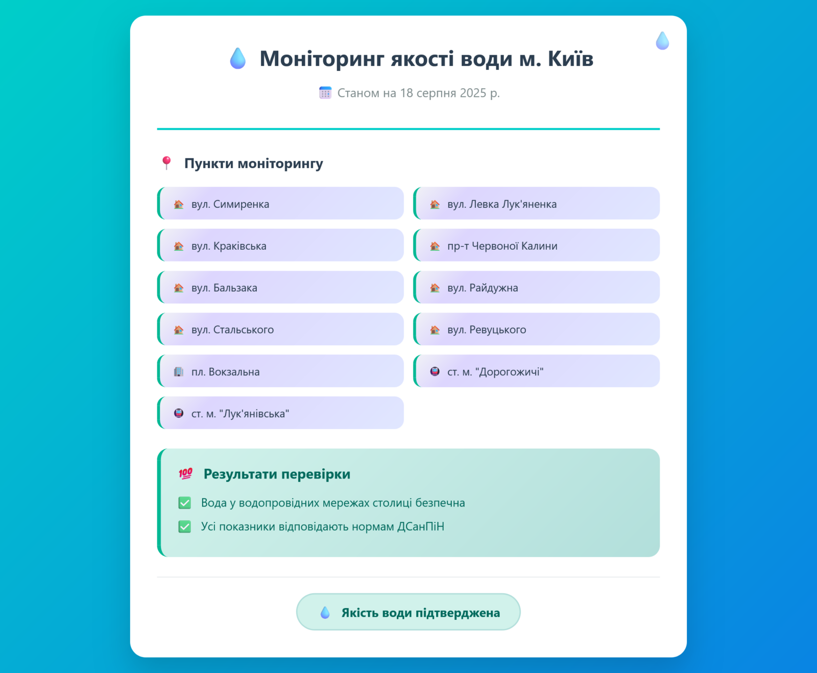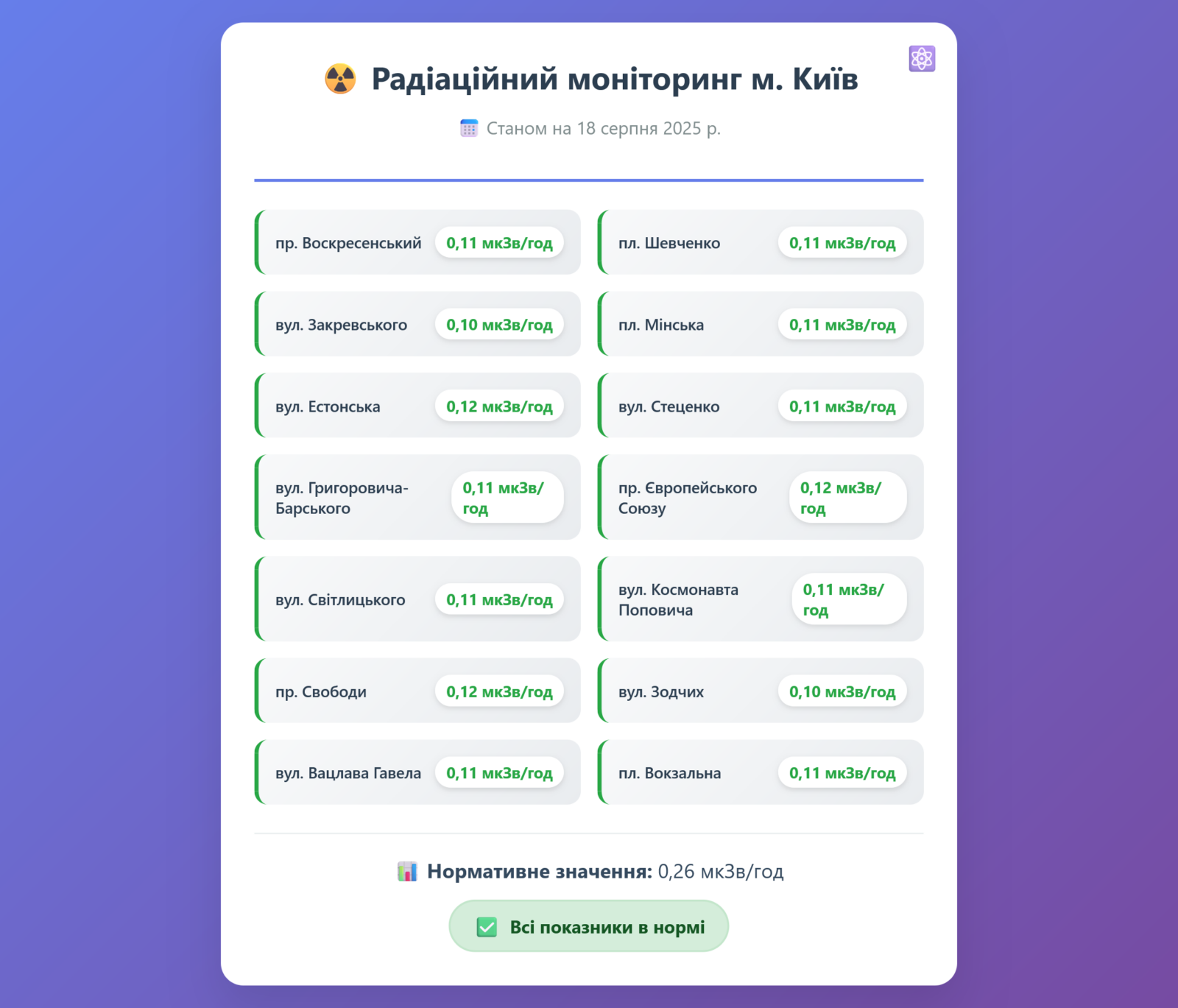 Радіаційний гамма фон, дані по атмосферному повітрю, відібрані проби питної води.