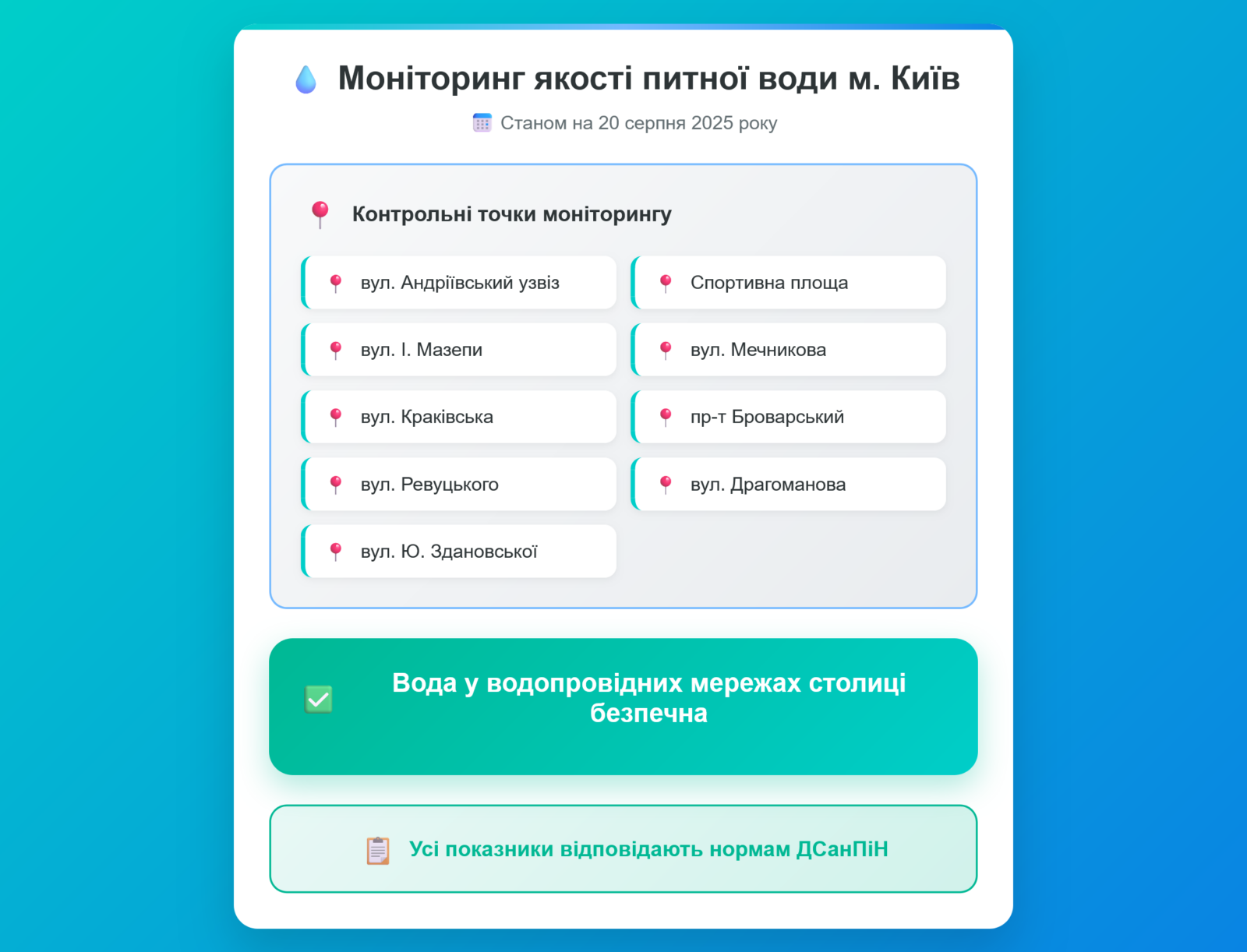 Радіаційний гамма фон, дані по атмосферному повітрю, відібрані проби питної води.