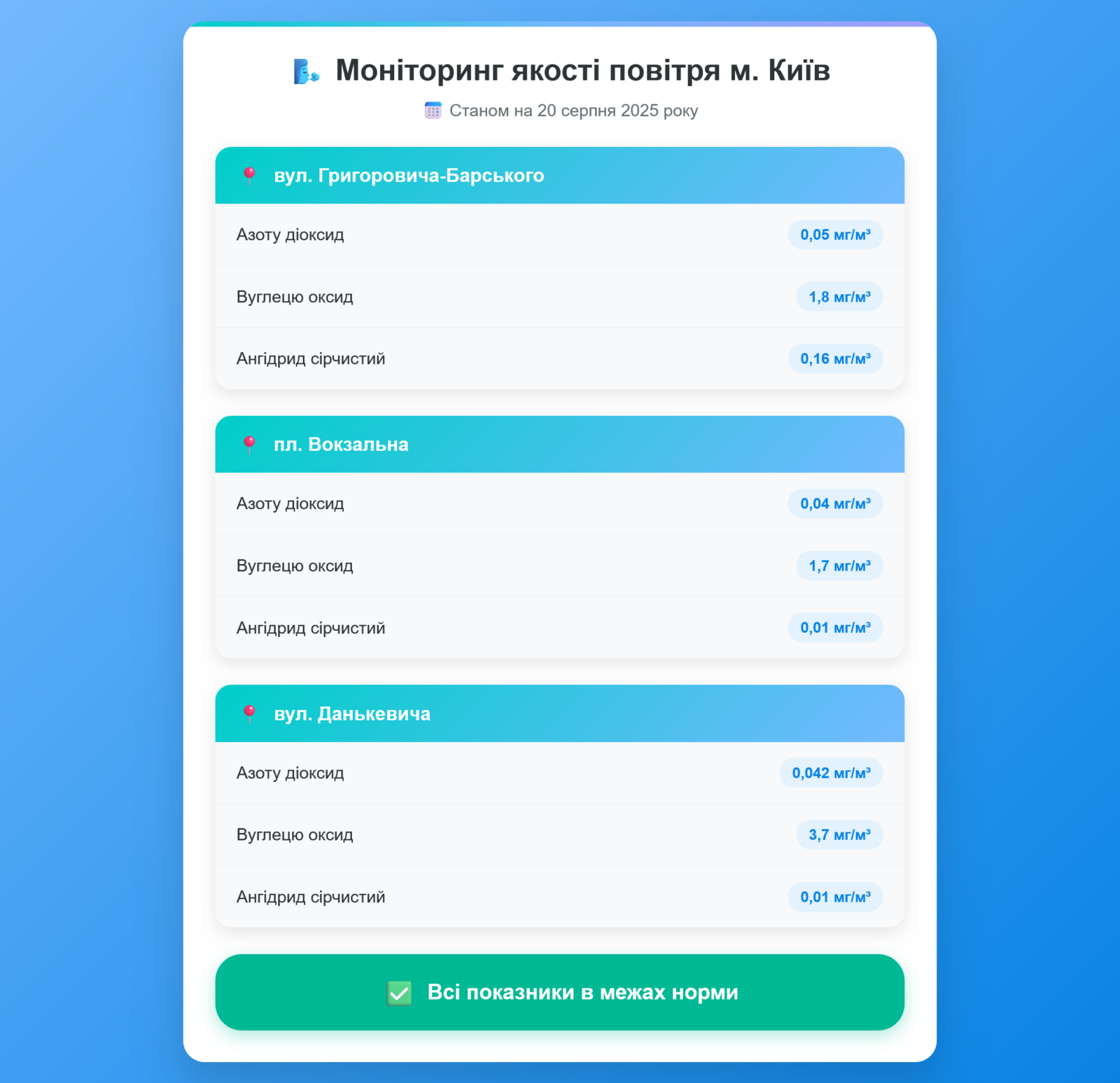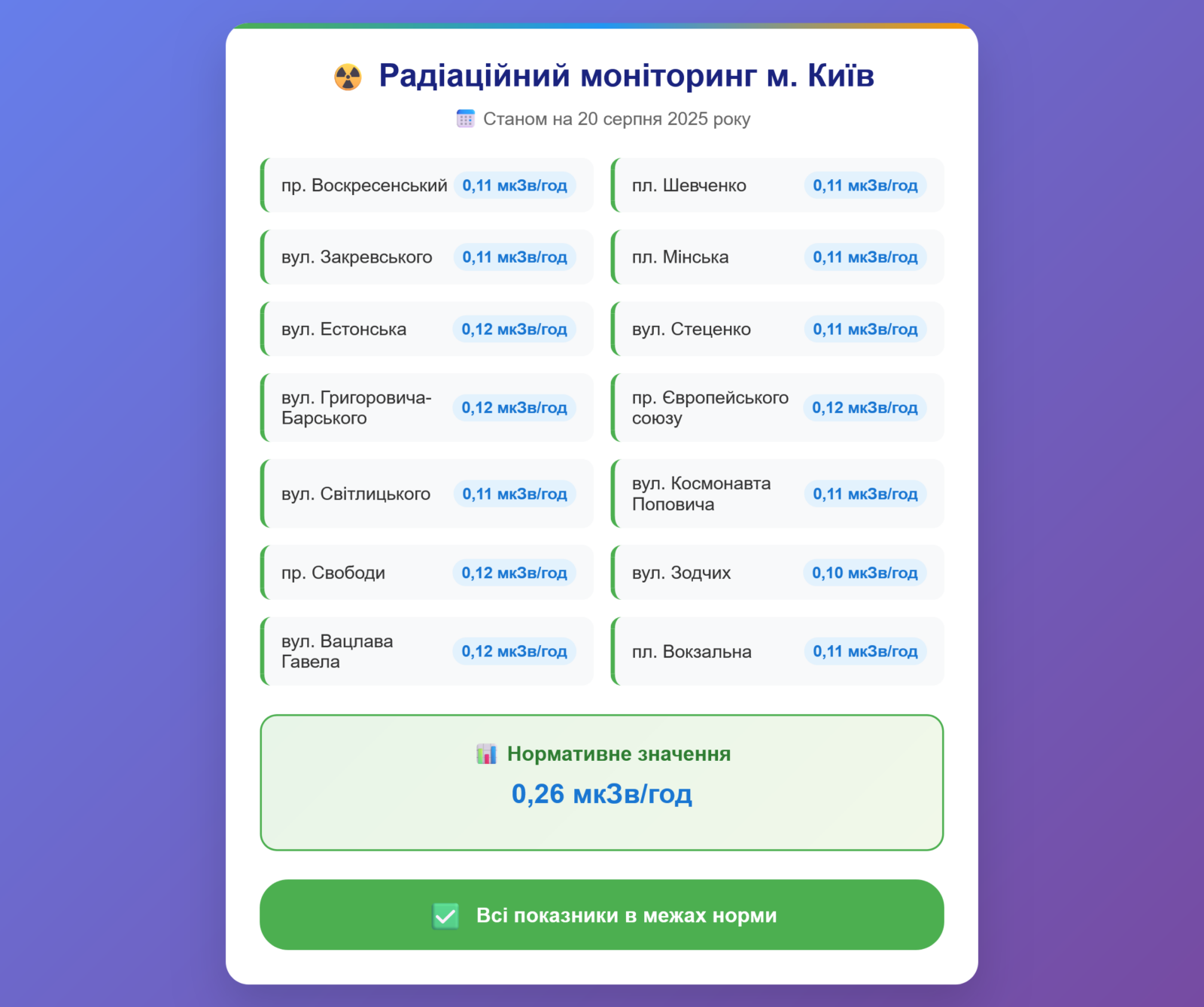 Радіаційний гамма фон, дані по атмосферному повітрю, відібрані проби питної води.