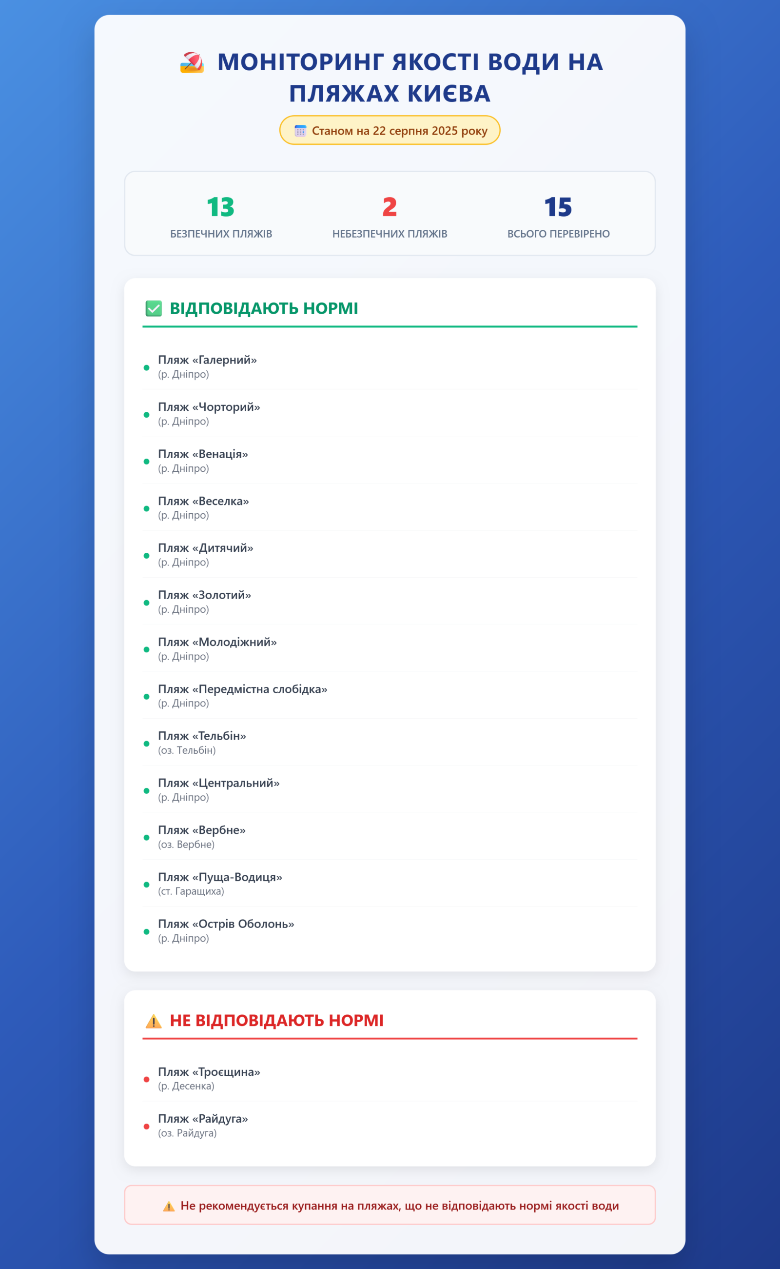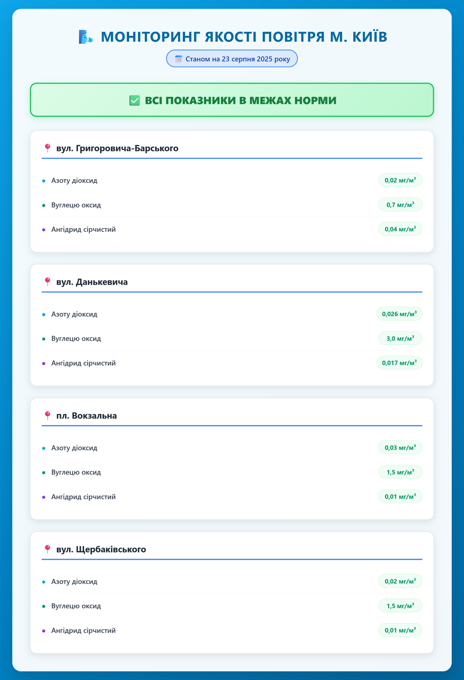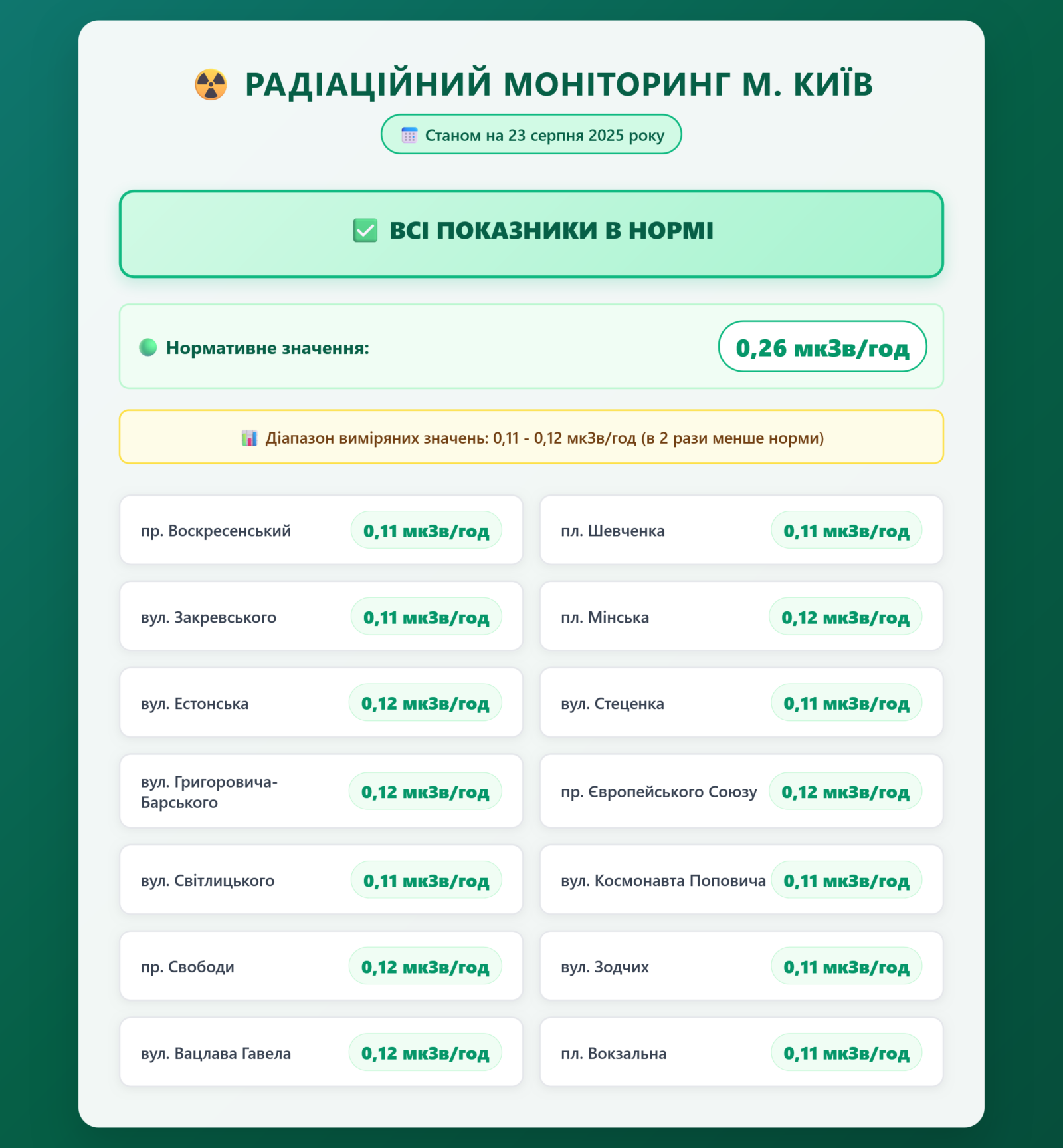Радіаційний гамма фон, дані по атмосферному повітрю, відібрані проби питної води.