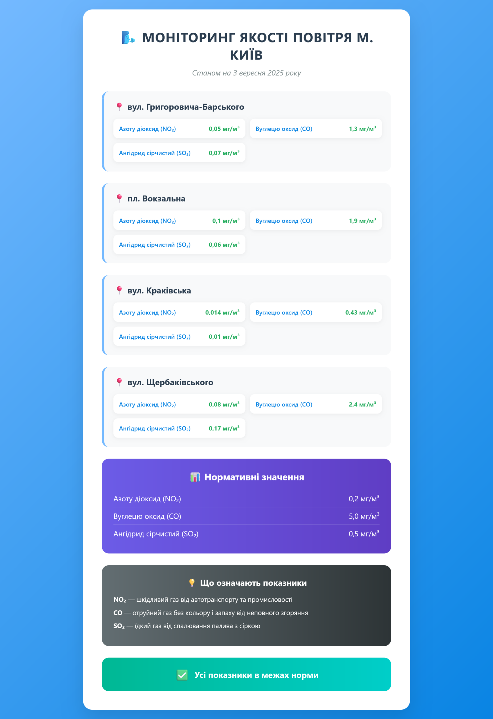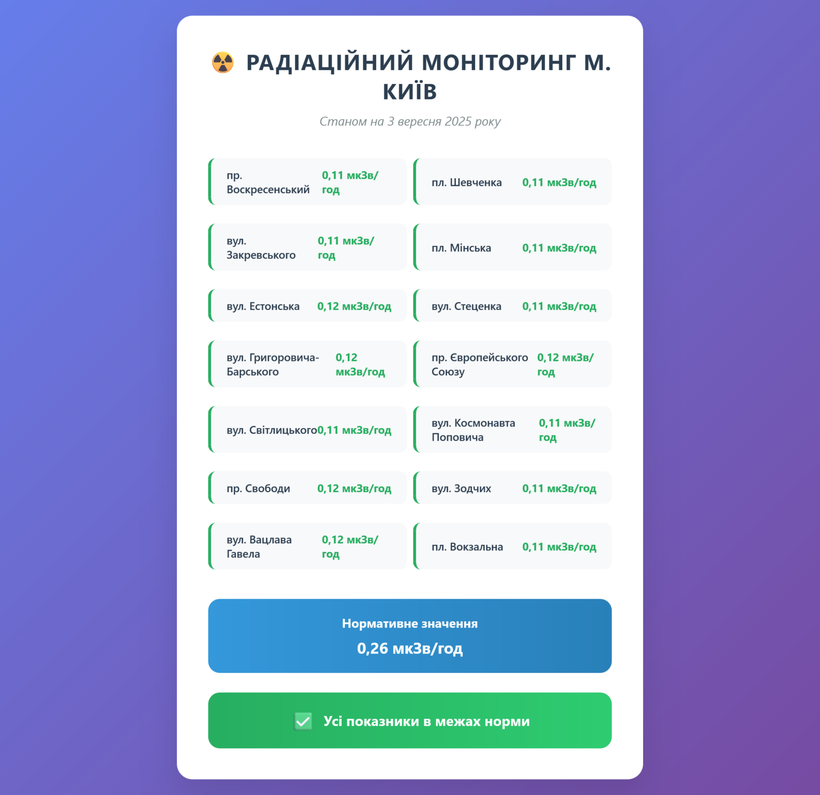 Радіаційний гамма фон, дані по атмосферному повітрю, відібрані проби питної води.