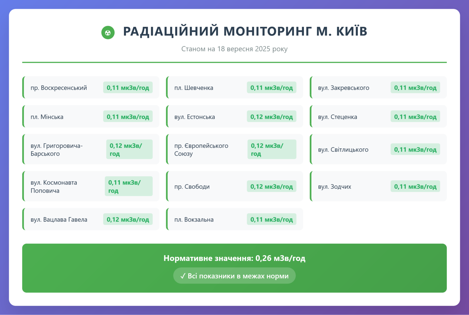 Радіаційний гамма фон, дані по атмосферному повітрю, відібрані проби питної води.