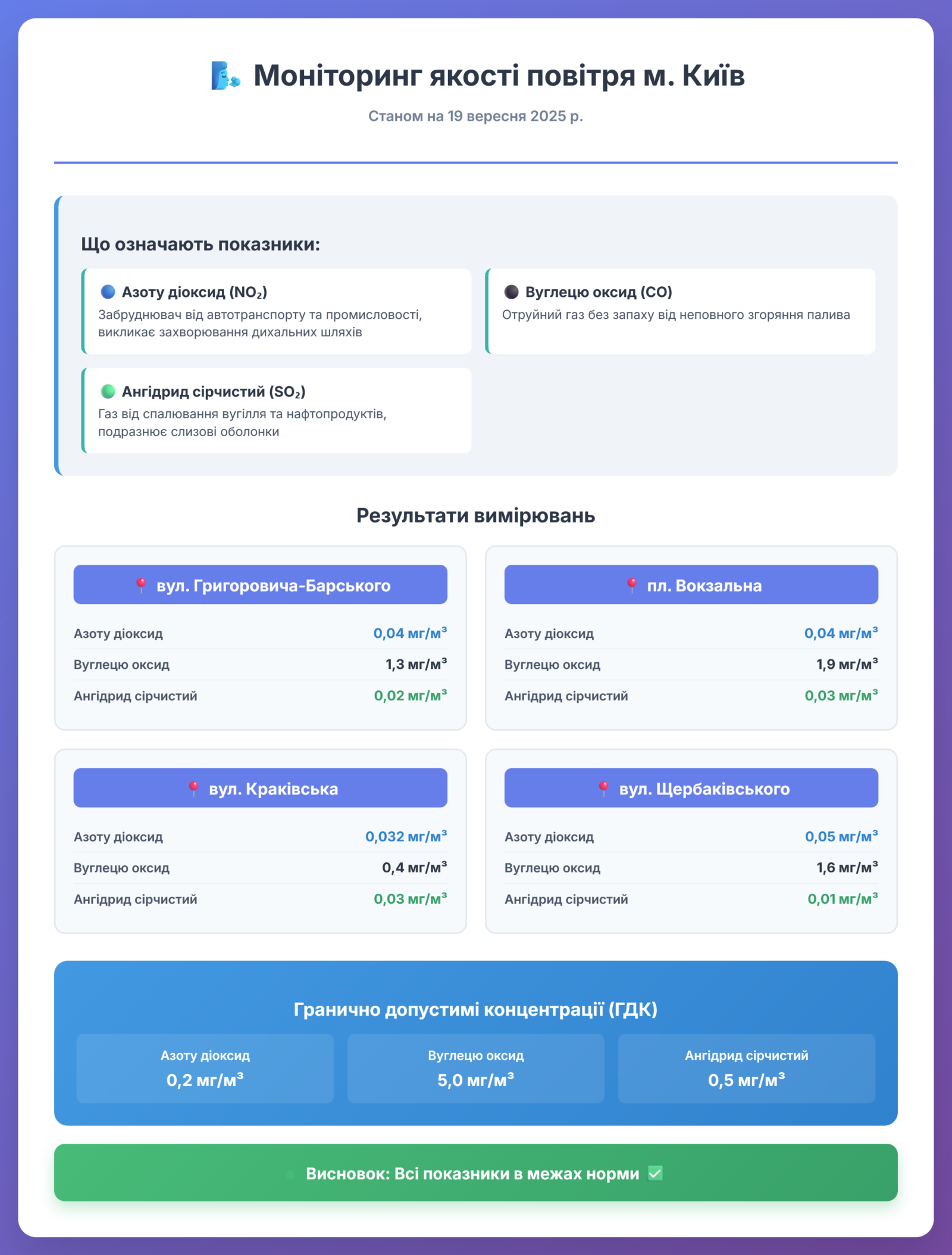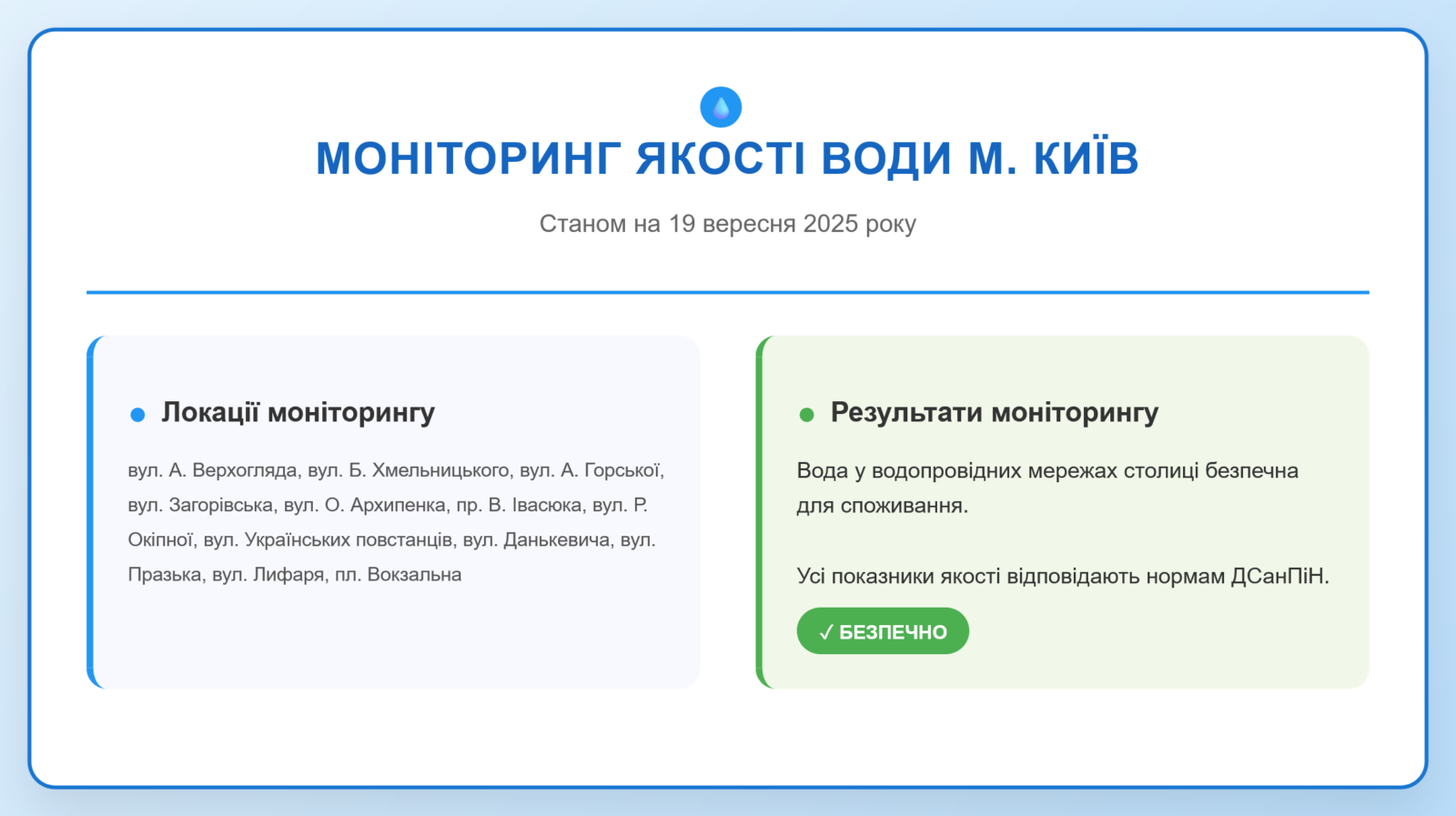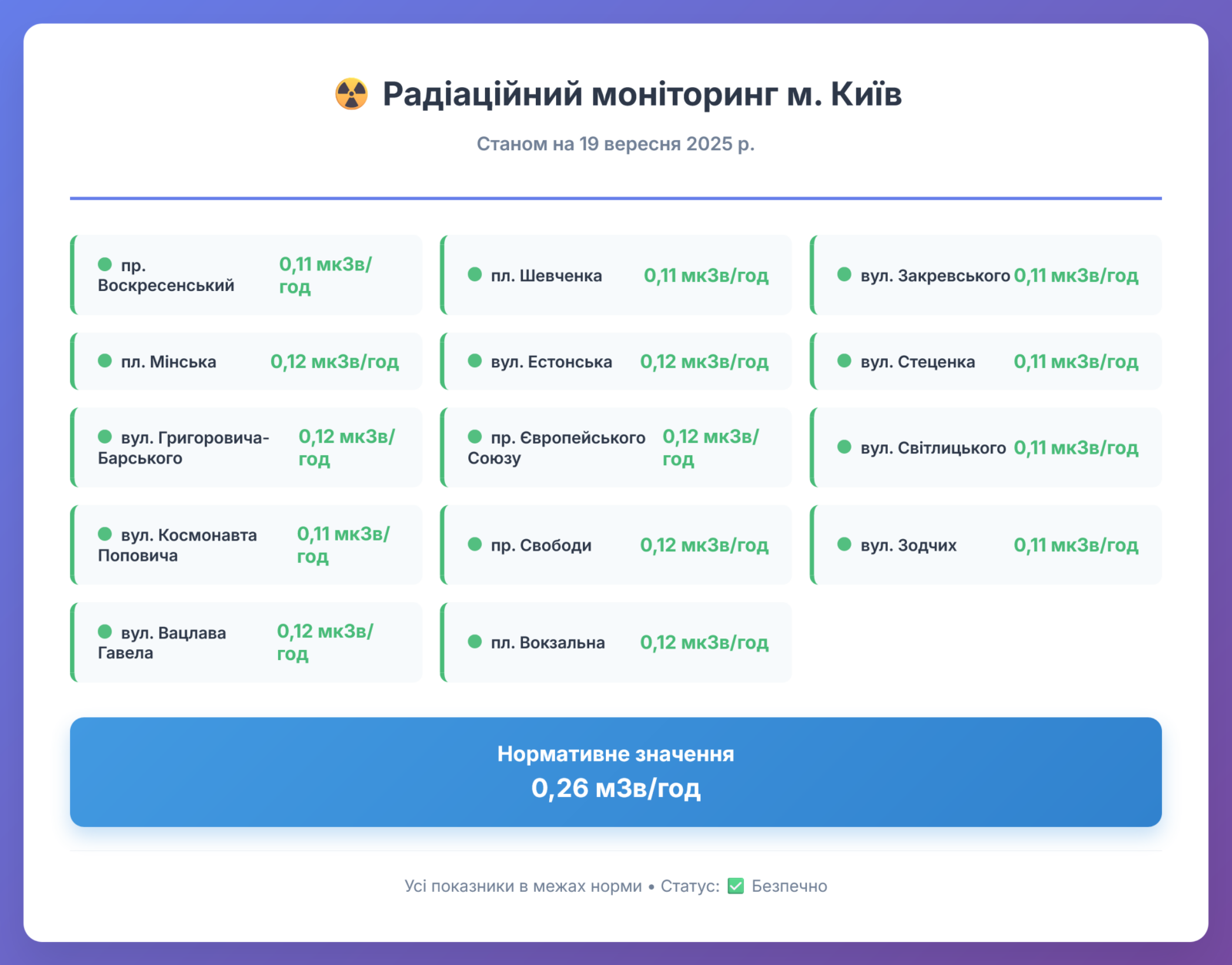 Радіаційний гамма фон, дані по атмосферному повітрю, відібрані проби питної води.