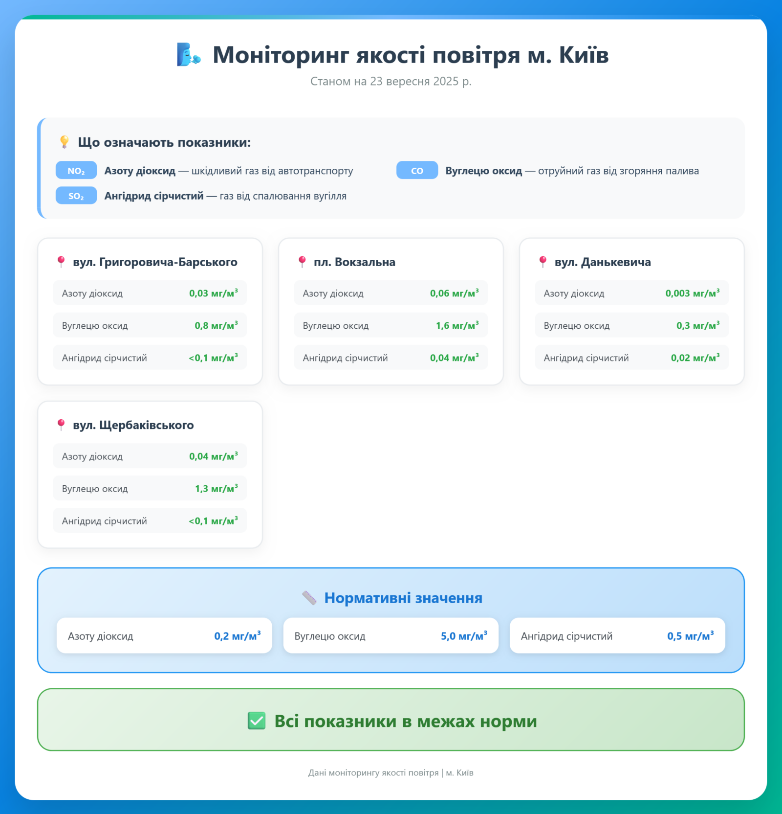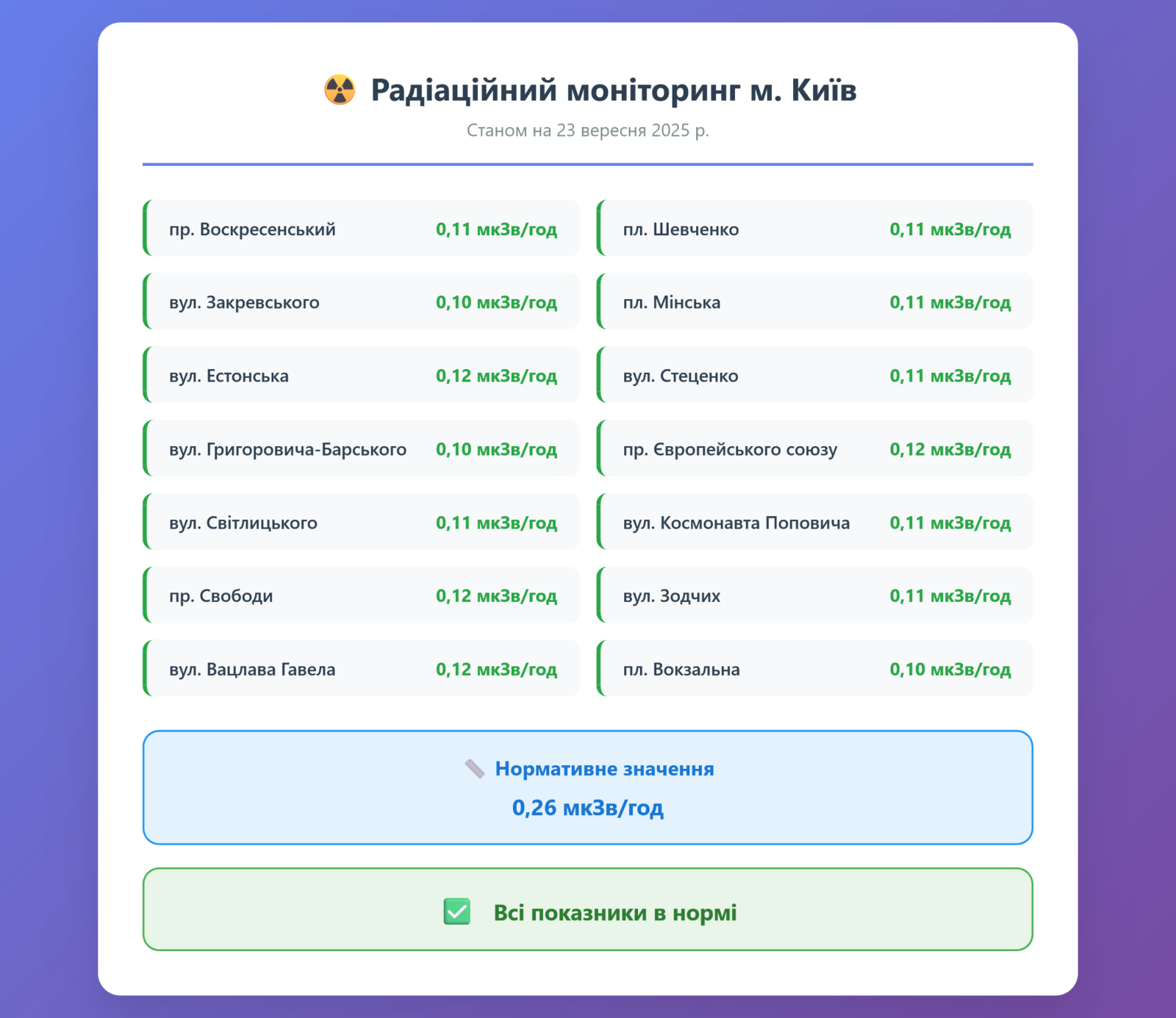 Радіаційний гамма фон, дані по атмосферному повітрю, відібрані проби питної води.
