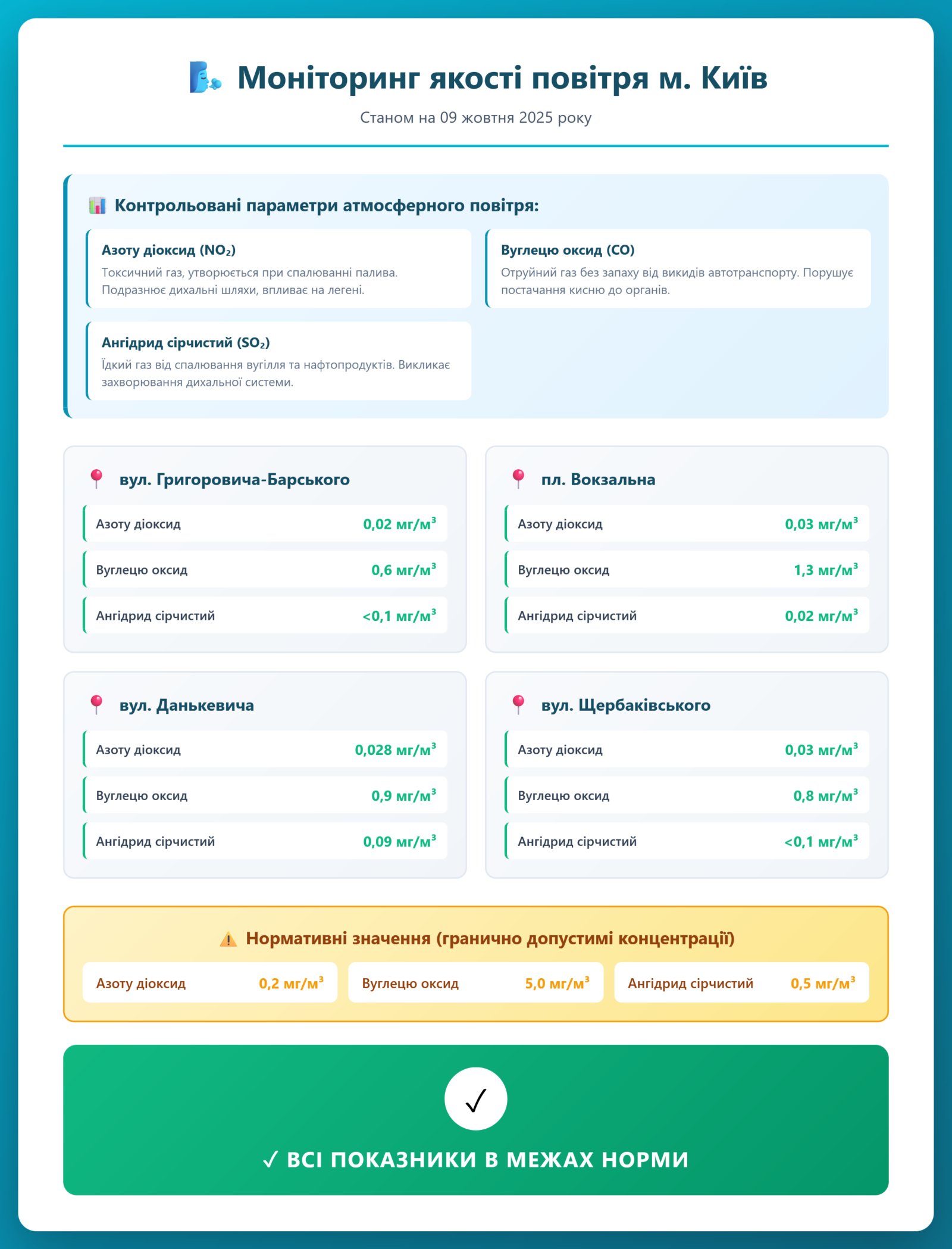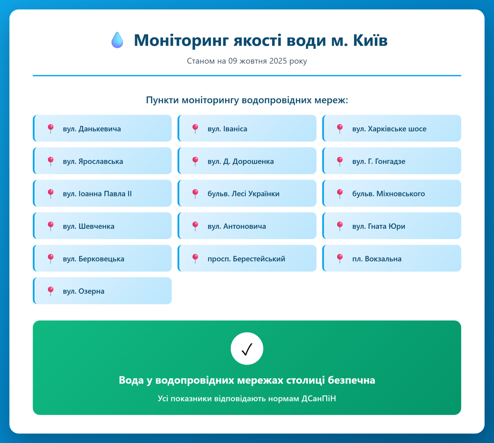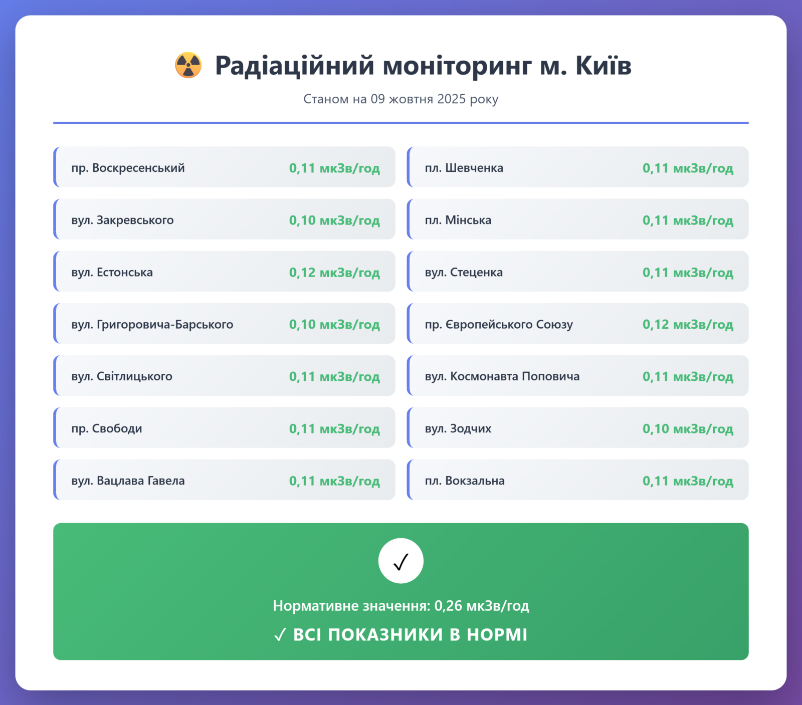 Радіаційний гамма фон, дані по атмосферному повітрю, відібрані проби питної води.