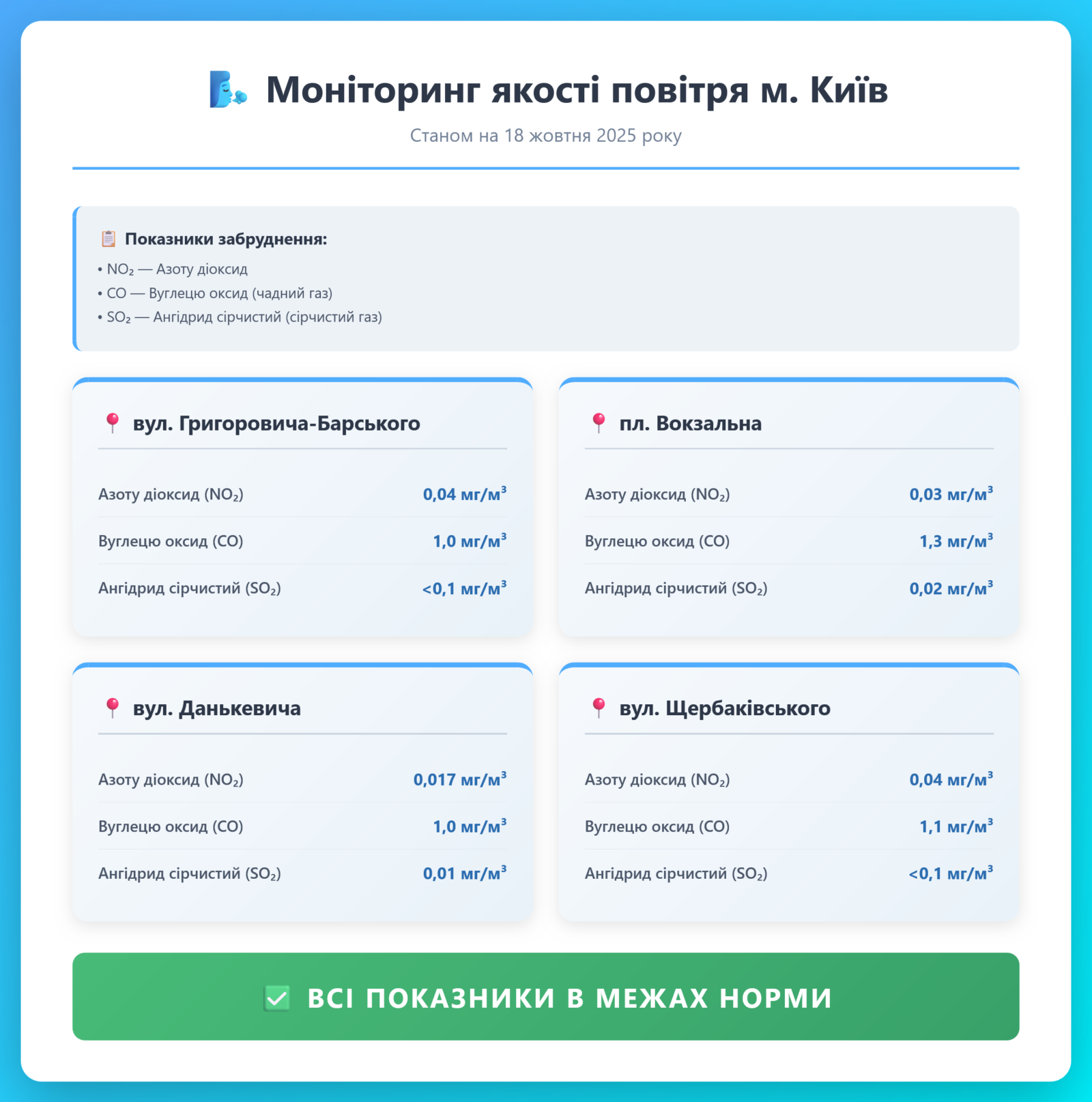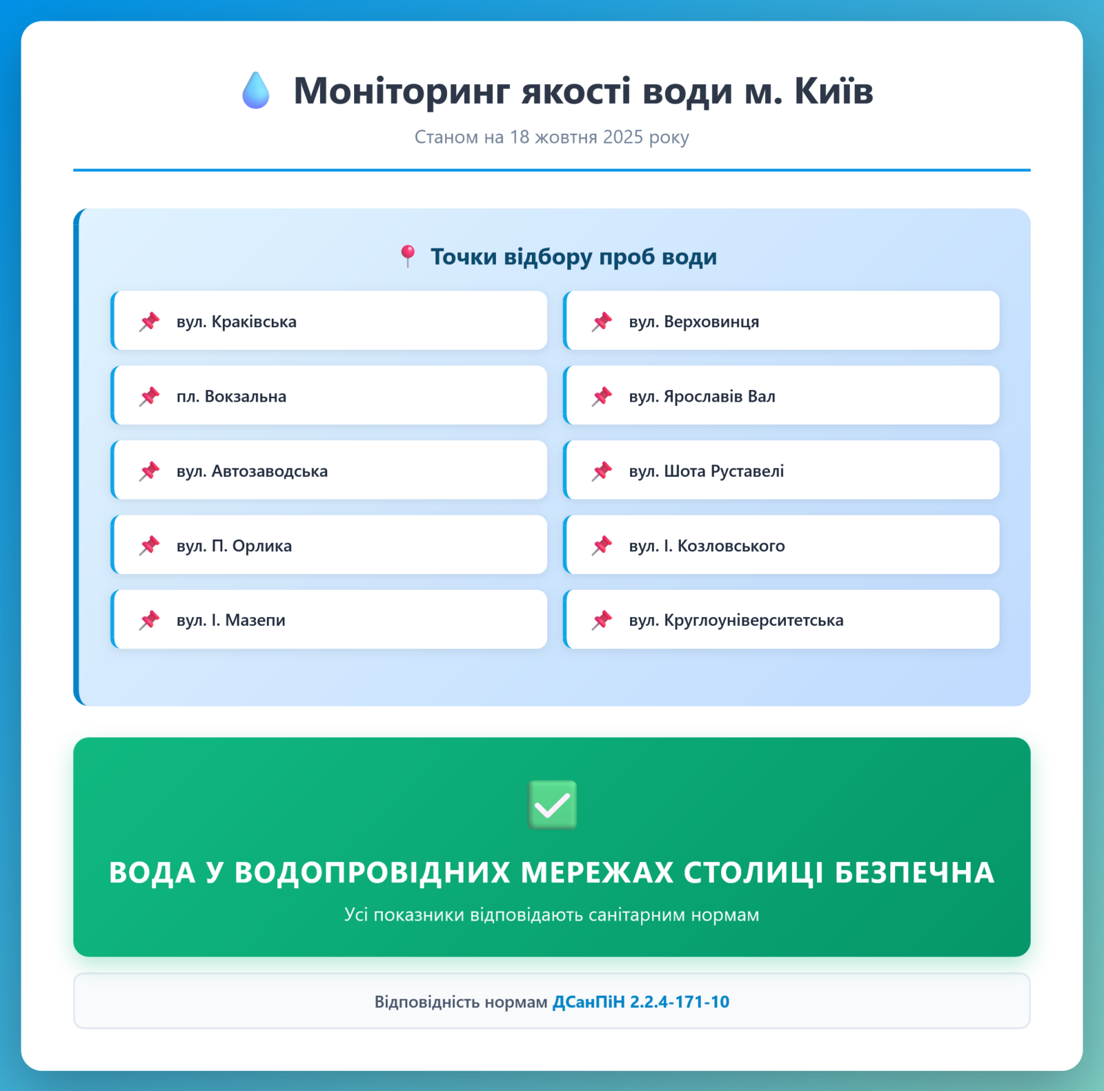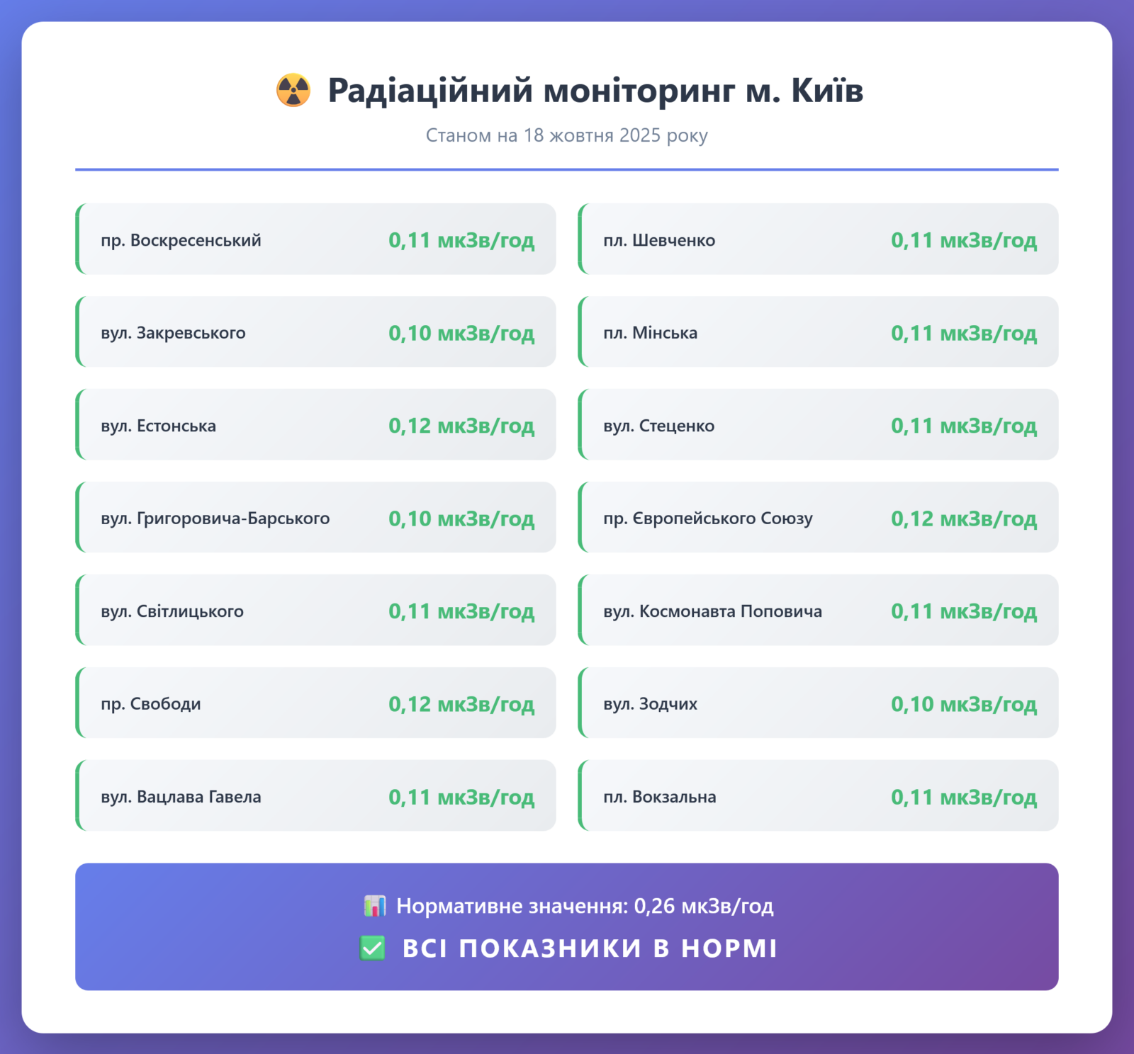 Радіаційний гамма фон, дані по атмосферному повітрю, відібрані проби питної води.