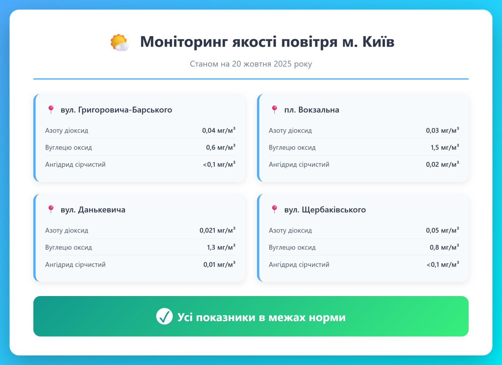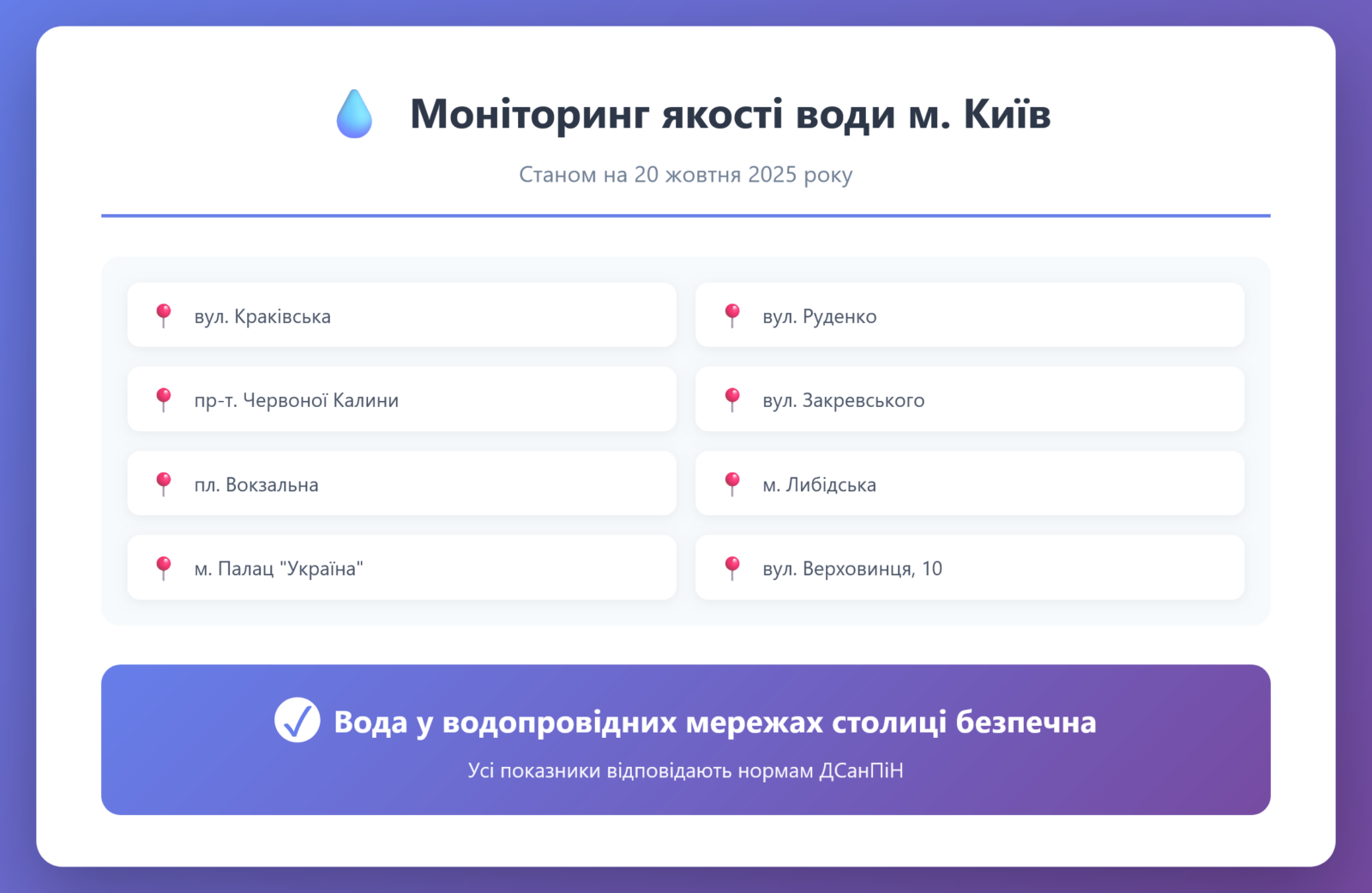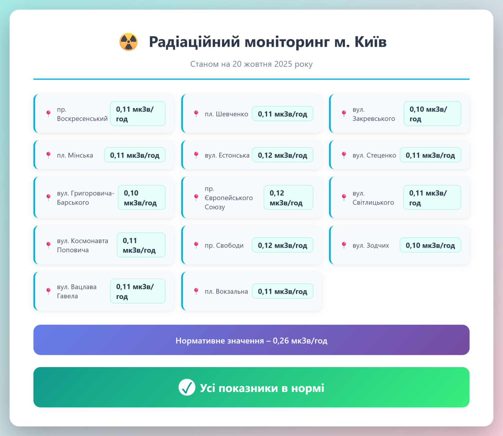 Радіаційний гамма фон, дані по атмосферному повітрю, відібрані проби питної води.