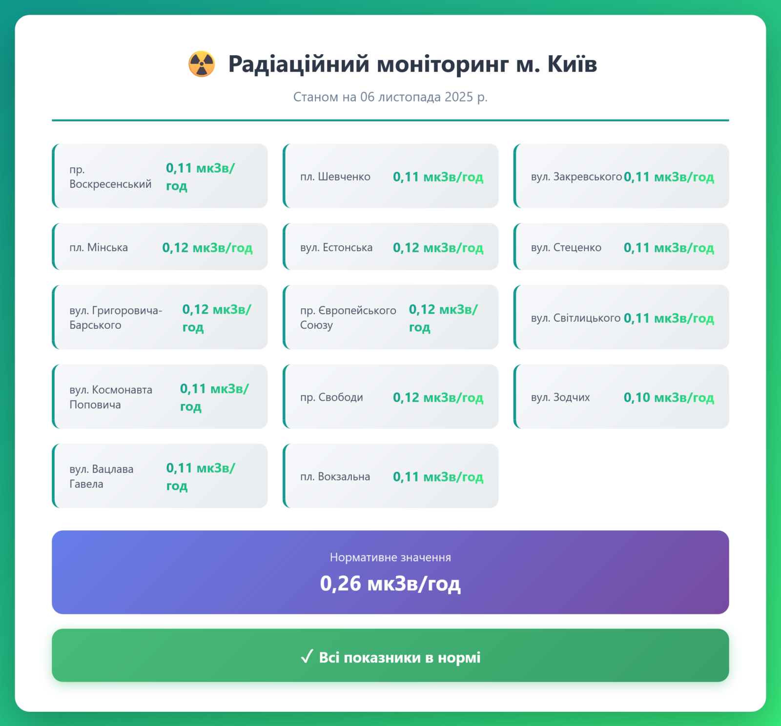 Радіаційний гамма фон, дані по атмосферному повітрю, відібрані проби питної води.