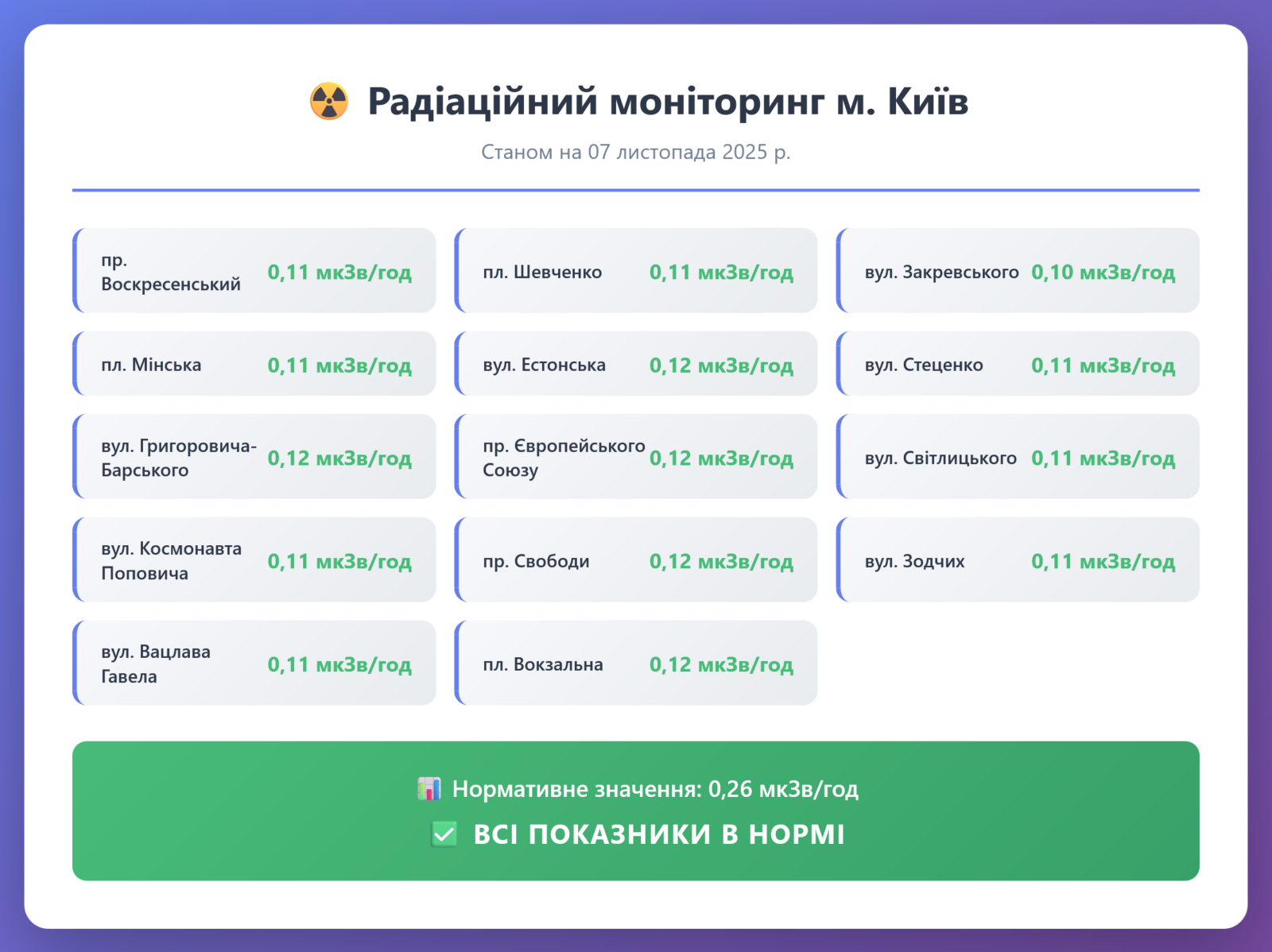 Радіаційний гамма фон, дані по атмосферному повітрю, відібрані проби питної води.