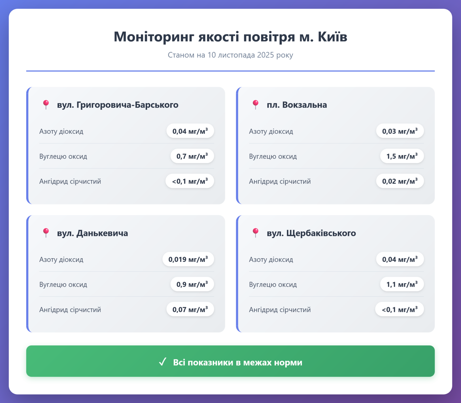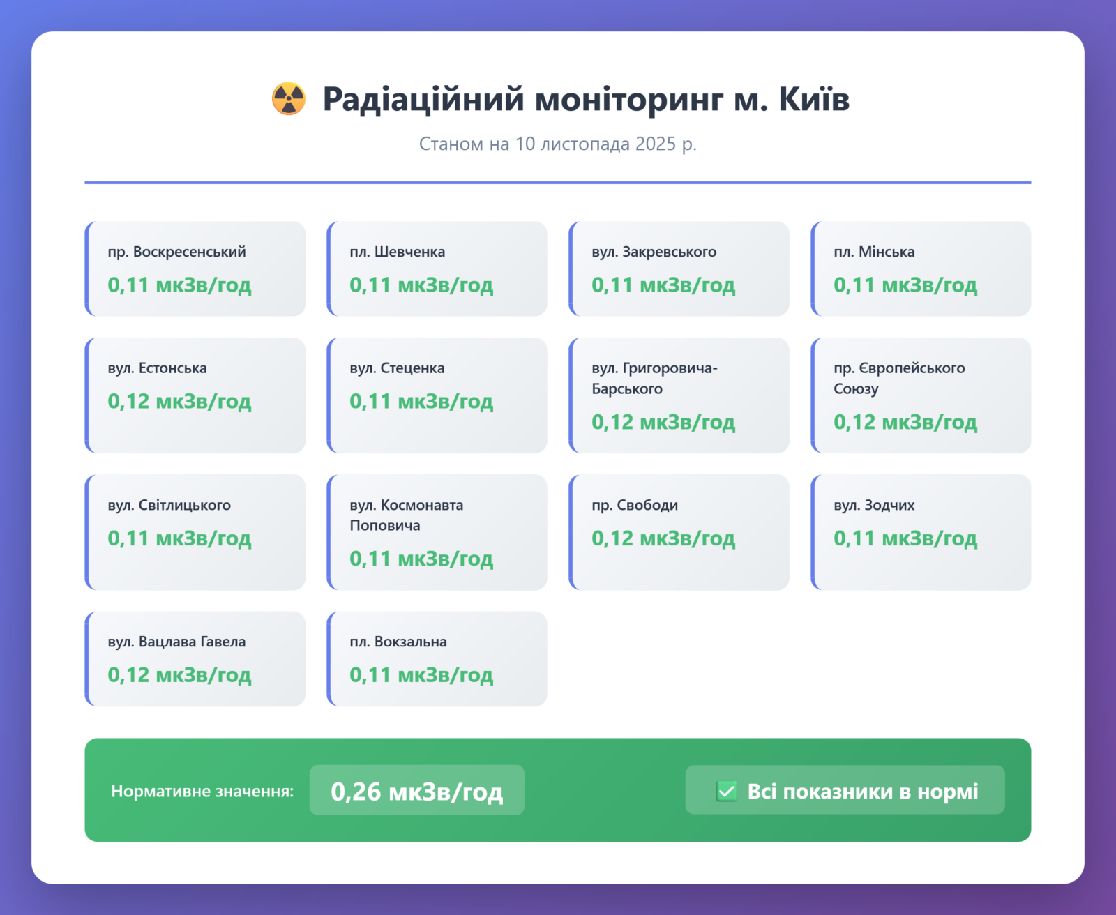 Радіаційний гамма фон, дані по атмосферному повітрю, відібрані проби питної води.