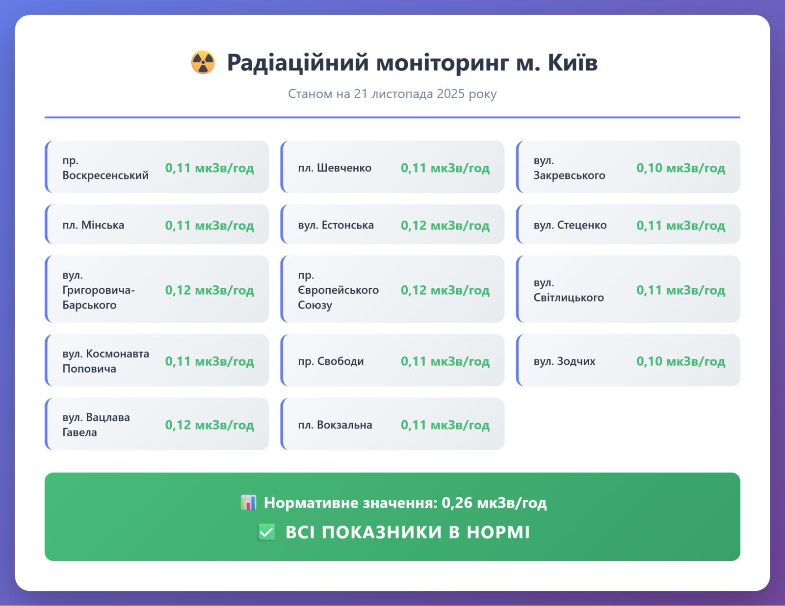 Радіаційний гамма фон, дані по атмосферному повітрю, відібрані проби питної води.