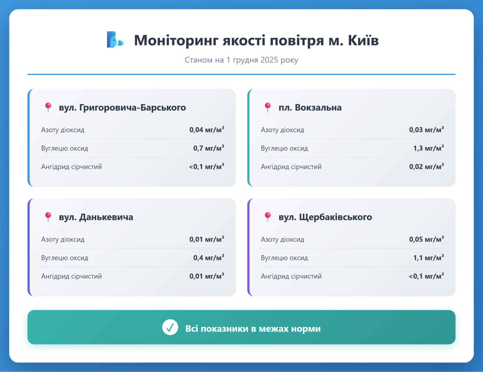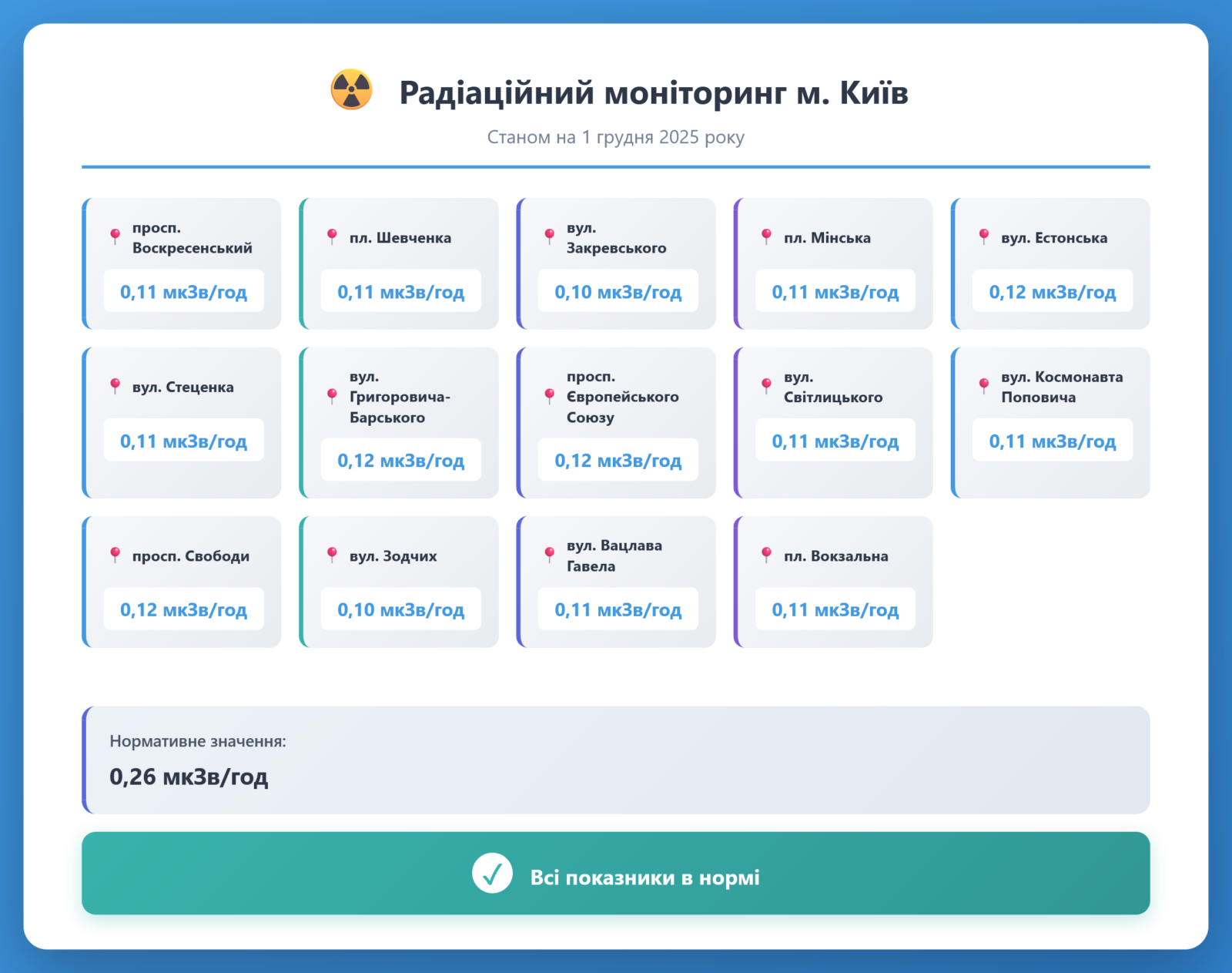 Радіаційний гамма фон, дані по атмосферному повітрю, відібрані проби питної води.