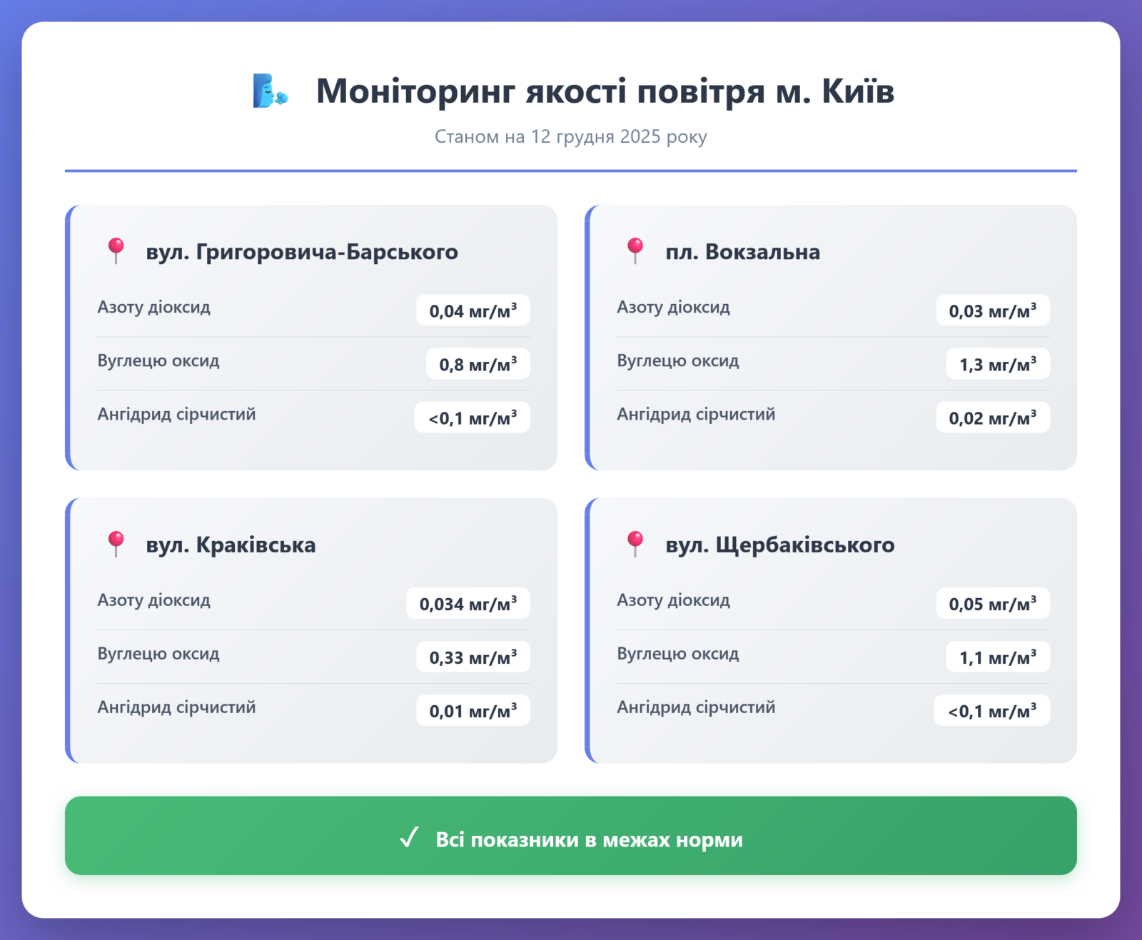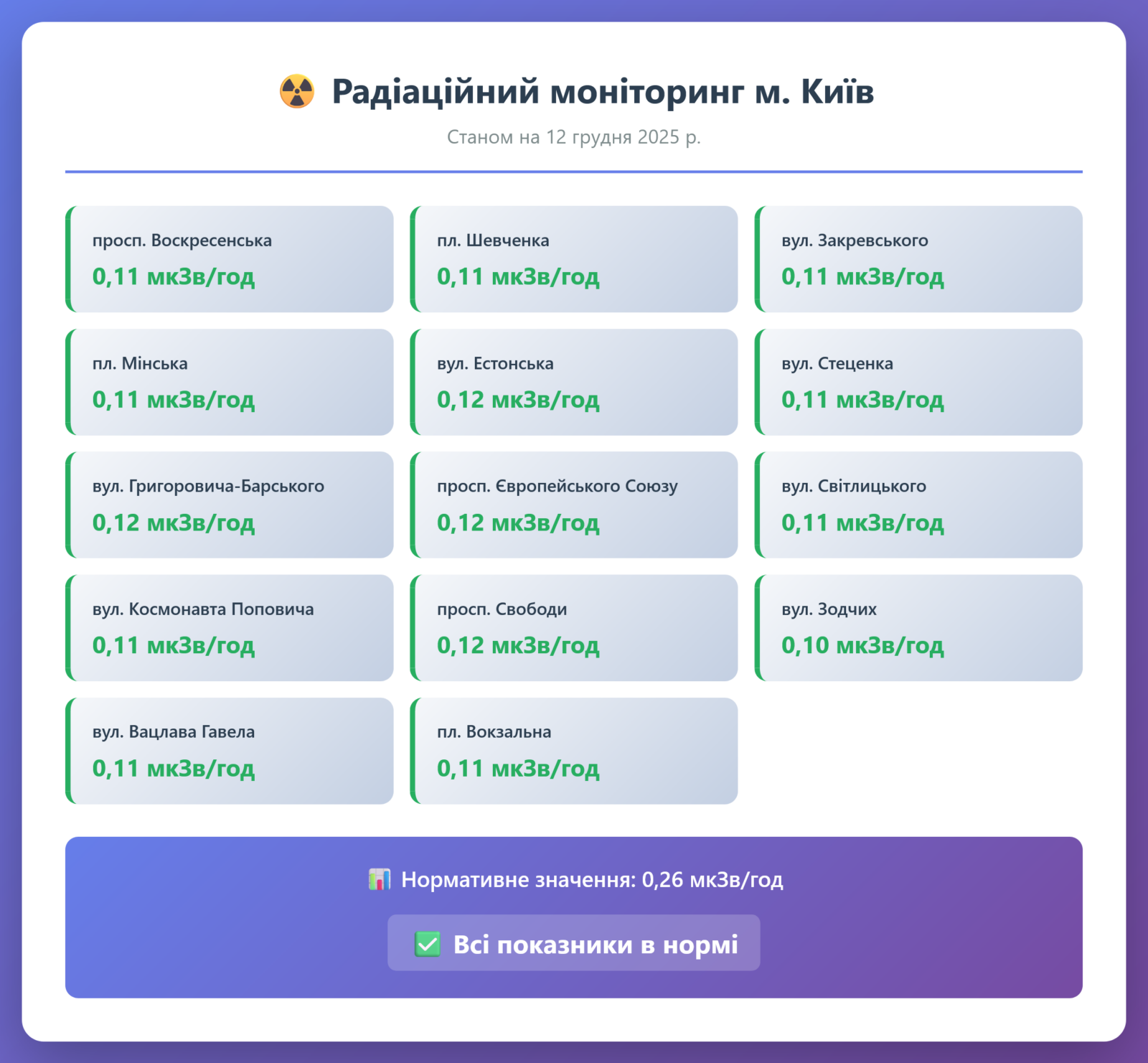 Радіаційний гамма фон, дані по атмосферному повітрю, відібрані проби питної води.