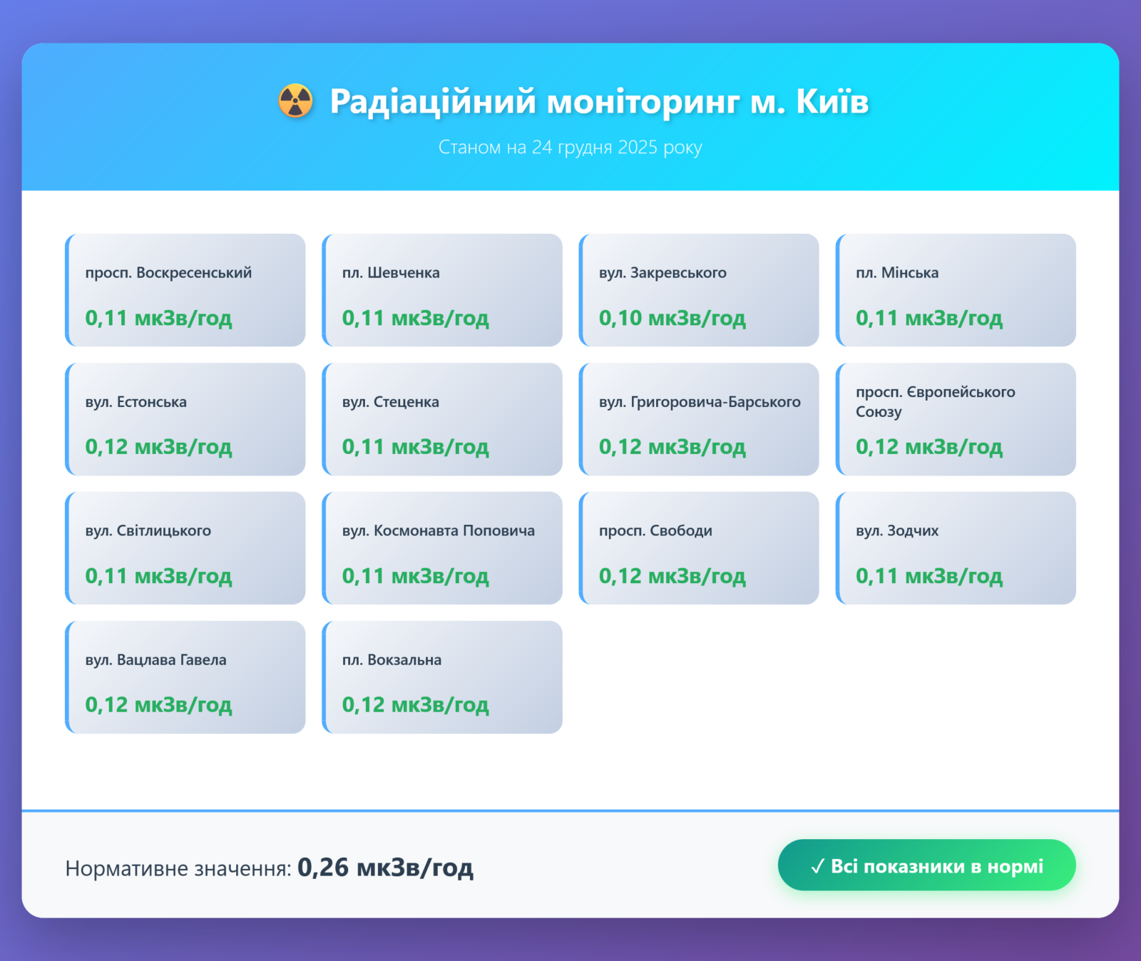 Радіаційний гамма фон, дані по атмосферному повітрю, відібрані проби питної води.