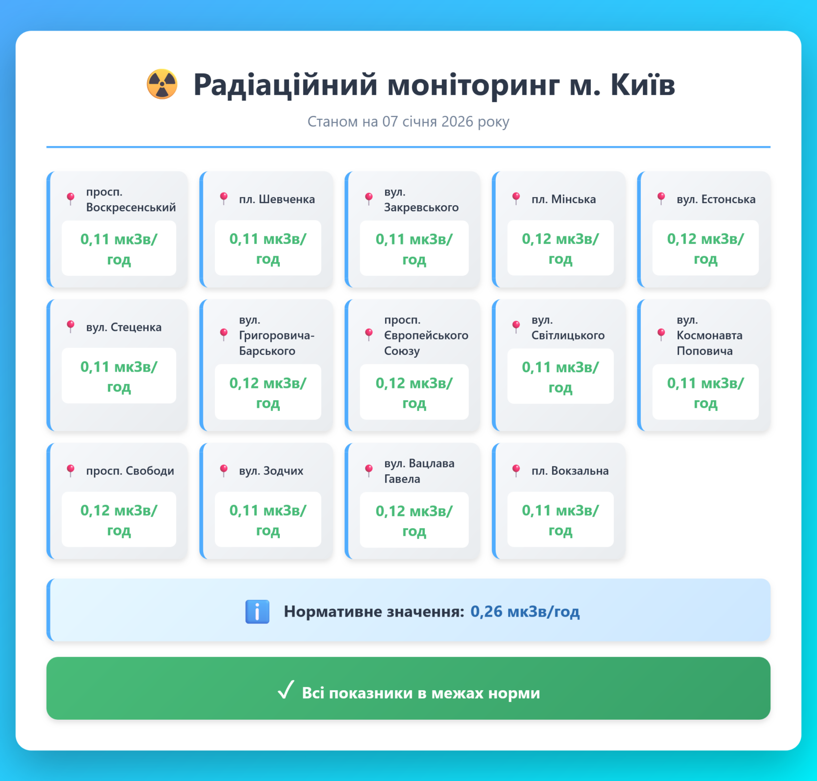 Радіаційний гамма фон, дані по атмосферному повітрю, відібрані проби питної води.