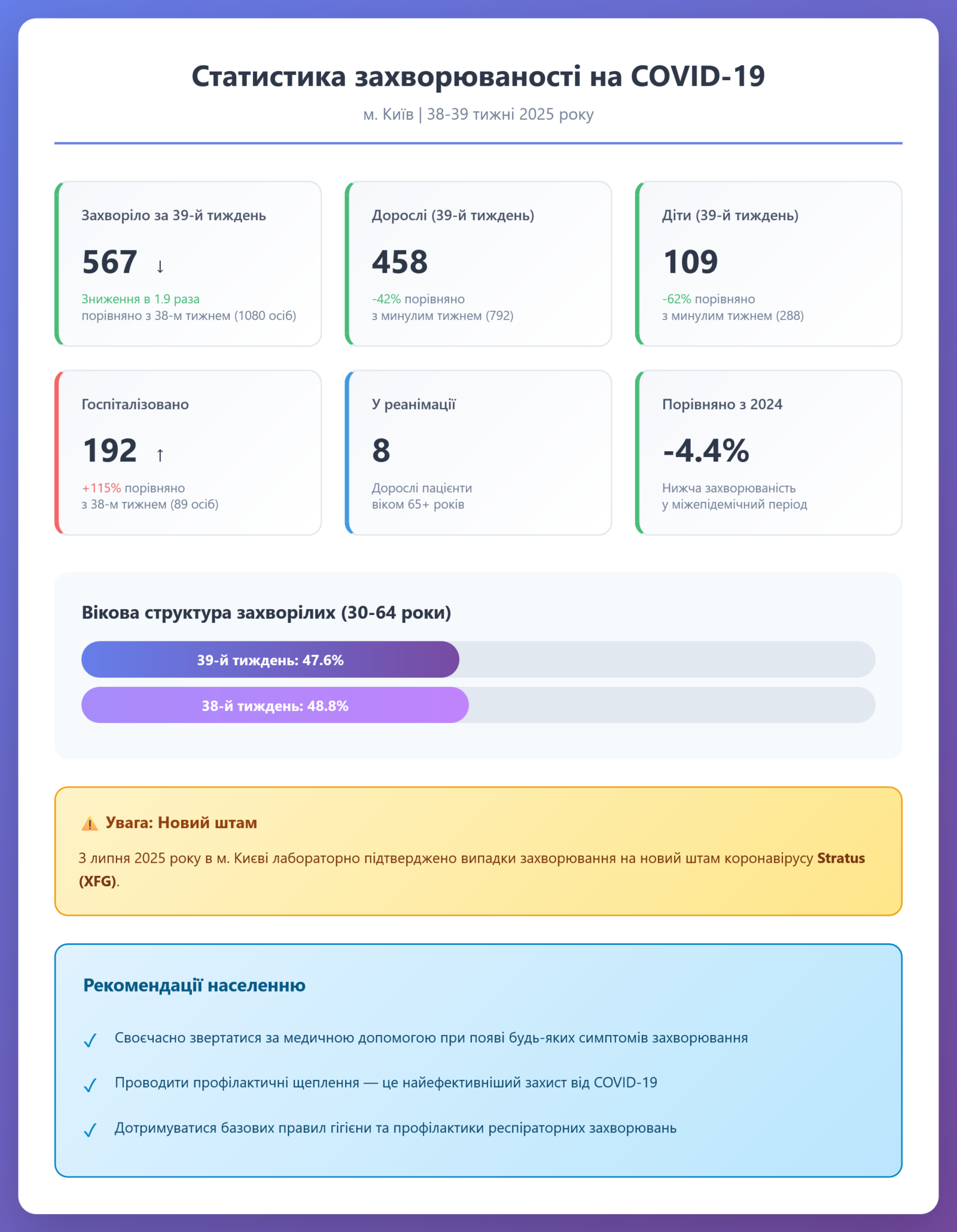 ✅ За 39-й тиждень 2025 року захворюваність на COVID-19 ЗНИЗИЛАСЯ у 1,9 раза у порівнянні з попереднім тижнем: