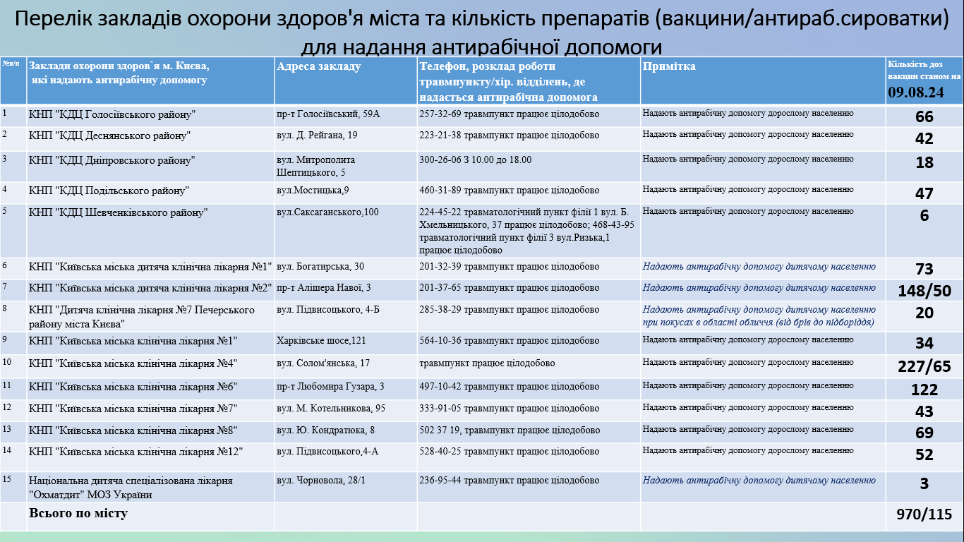 Перелік закладів охорони здоров’я міста та кількість препаратів (вакцини/антираб. сироватки) для надання антирабічної допомоги.