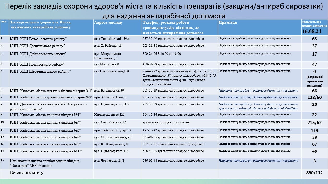 Перелік закладів охорони здоров’я міста та кількість препаратів (вакцини/антираб. сироватки) для надання антирабічної допомоги.
