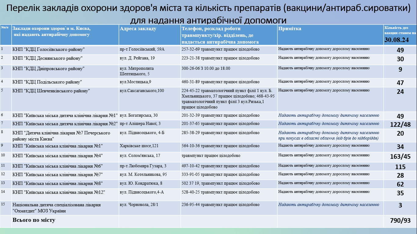 Перелік закладів охорони здоров’я міста та кількість препаратів (вакцини/антираб. сироватки) для надання антирабічної допомоги.
