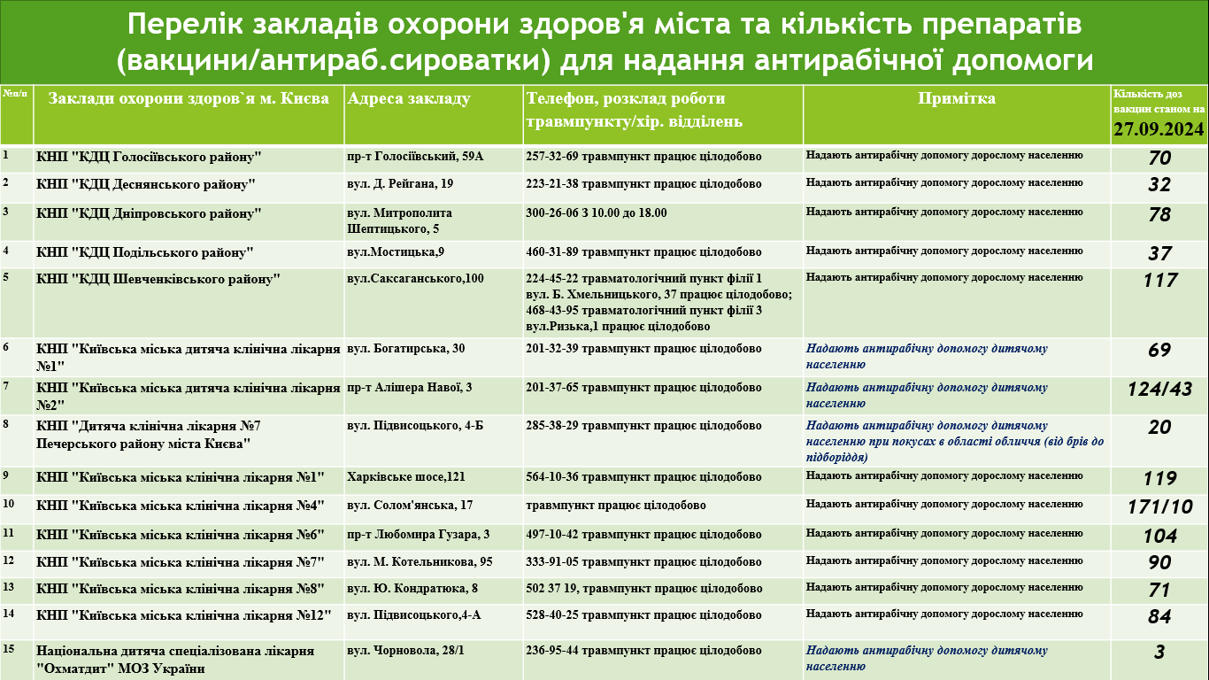 Перелік закладів охорони здоров'я міста та кількість препаратів (вакцини/антираб.сироватки) для надання антирабічної допомоги