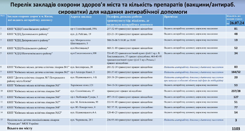 Перелік закладів охорони здоров’я міста та кількість препаратів (вакцини/антираб. сироватки) для надання антирабічної допомоги.