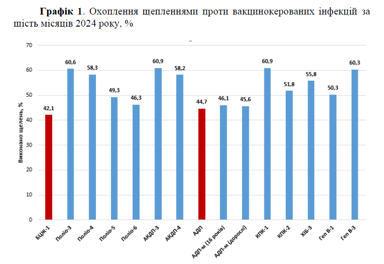 Найнижчі показники вакцинації за шість місяців 2024 року відмічаються проти дифтерії та правця серед дітей у віці 6 років – 44,7%.