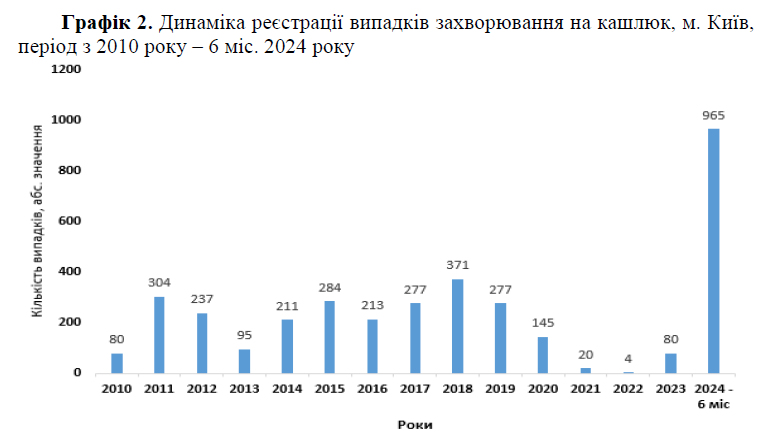 В місті Києві з початку 2024 року спостерігається значне зростання захворюваності на кашлюк. За 6 місяців поточного року зареєстровано 965 випадків (інтенсивний показник – 32,7) проти 13 випадків (інтенсивний показник – 0,44) за аналогічний період минулого року.