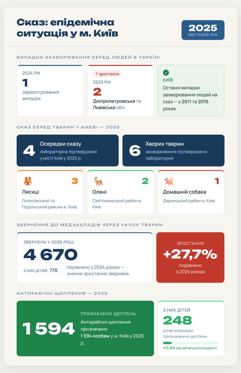 У 2025 році в Києві зафіксовано 4 осередки сказу, лабораторно підтверджено захворювання у 6 тварин:
