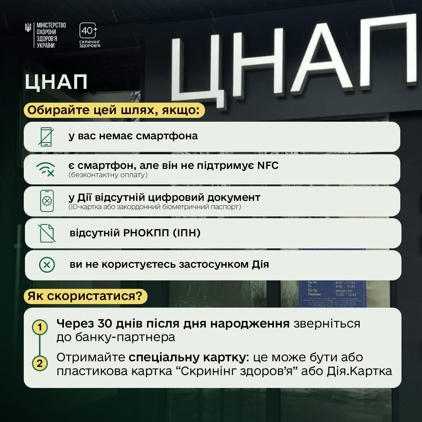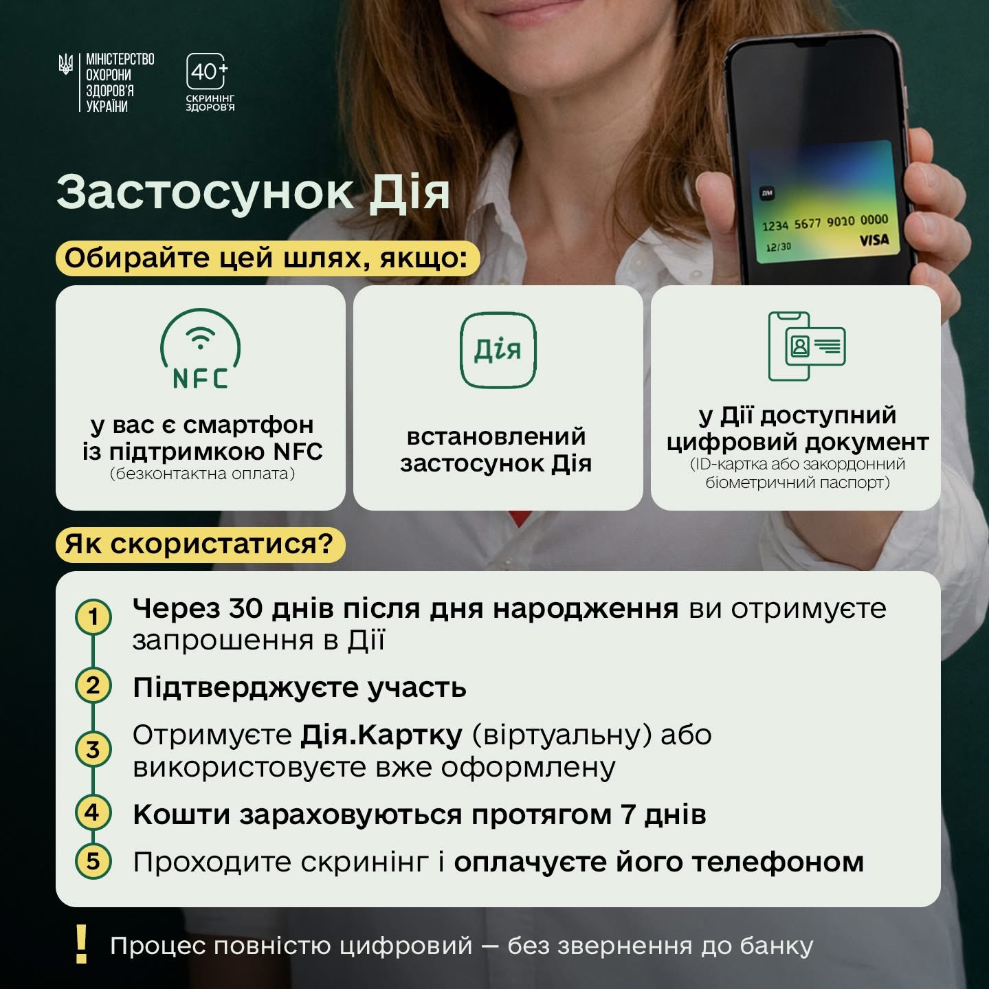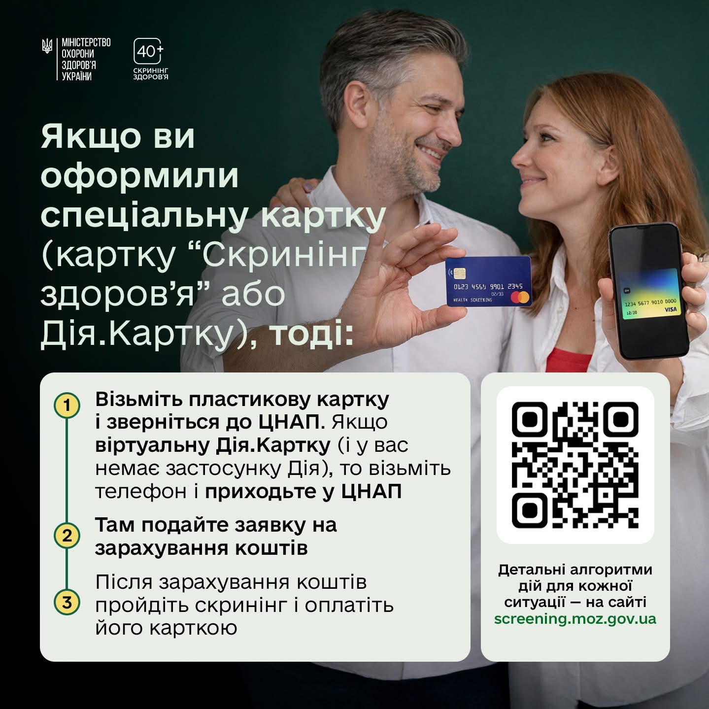 ℹ️ Нагадаємо, Скринінг здоров’я 40+ — це національна програма для українців та українок від 40 років і старше. Вона передбачає раннє виявлення серцево-судинних хвороб, цукрового діабету і проблем ментального здоров’я. Скринінг безоплатний: після подання заявки держава надає 2000 гривень на обстеження.