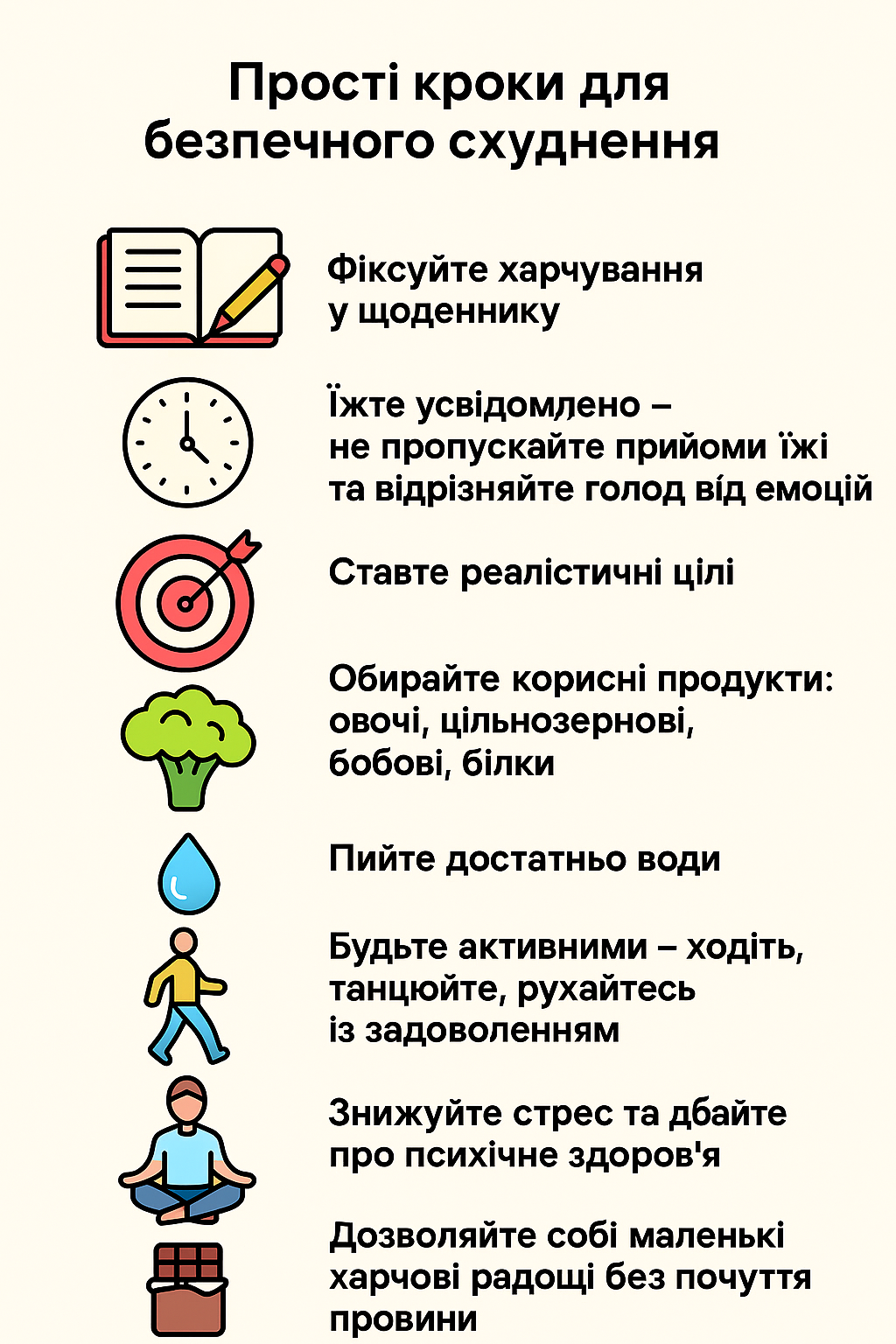 ❗ Пам’ятайте: здорове схуднення – це поступове зниження на 0,4–0,9 кг на тиждень. Це не «дієта на місяць», а інвестиція у ваше довге та якісне життя 💚