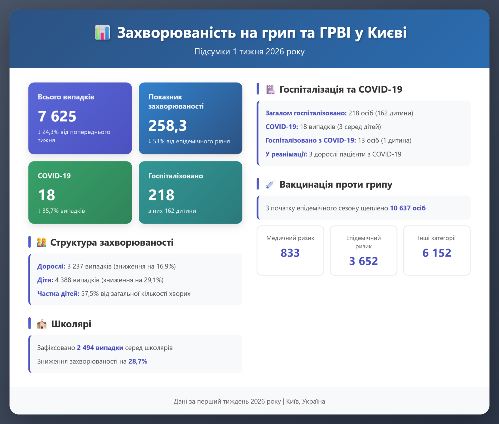 📊 Захворюваність на грип та ГРВІ у Києві: підсумки 1 тижня 2026 року.