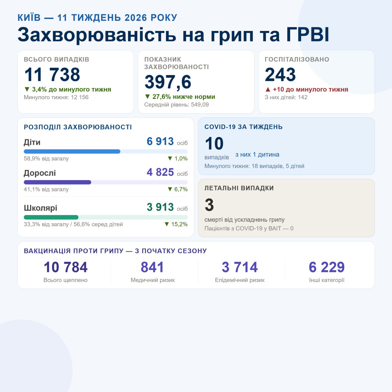 📊 Захворюваність на грип та ГРВІ у Києві: підсумки 11 тиждень 2026 року.