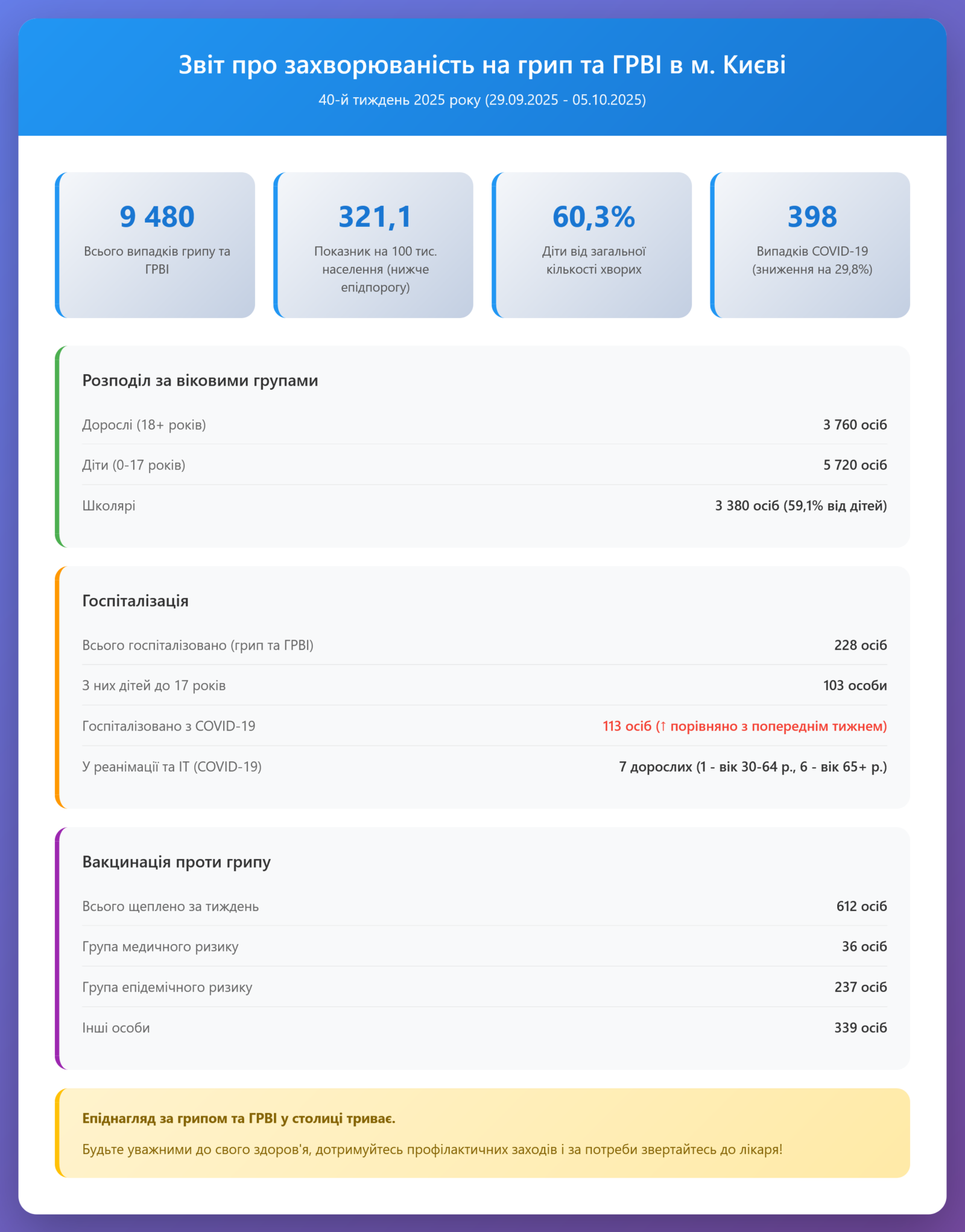 📊 Захворюваність на грип та ГРВІ у м. Києві за 40-й тиждень 2025 року.