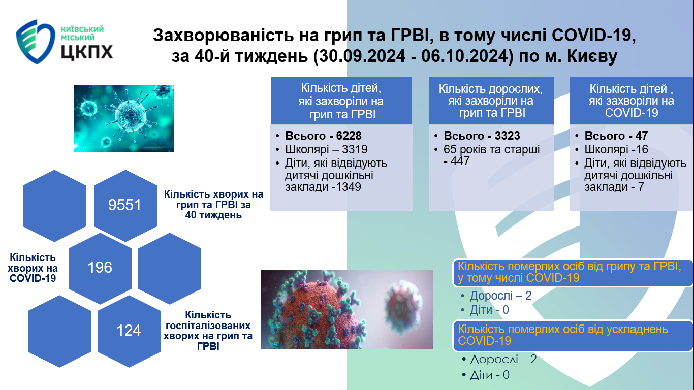 Захворюваність на грип та ГРВІ, в тому числі COVID-19, за 40-й тиждень (30.09.2024 – 06.10.2024) по м. Києву